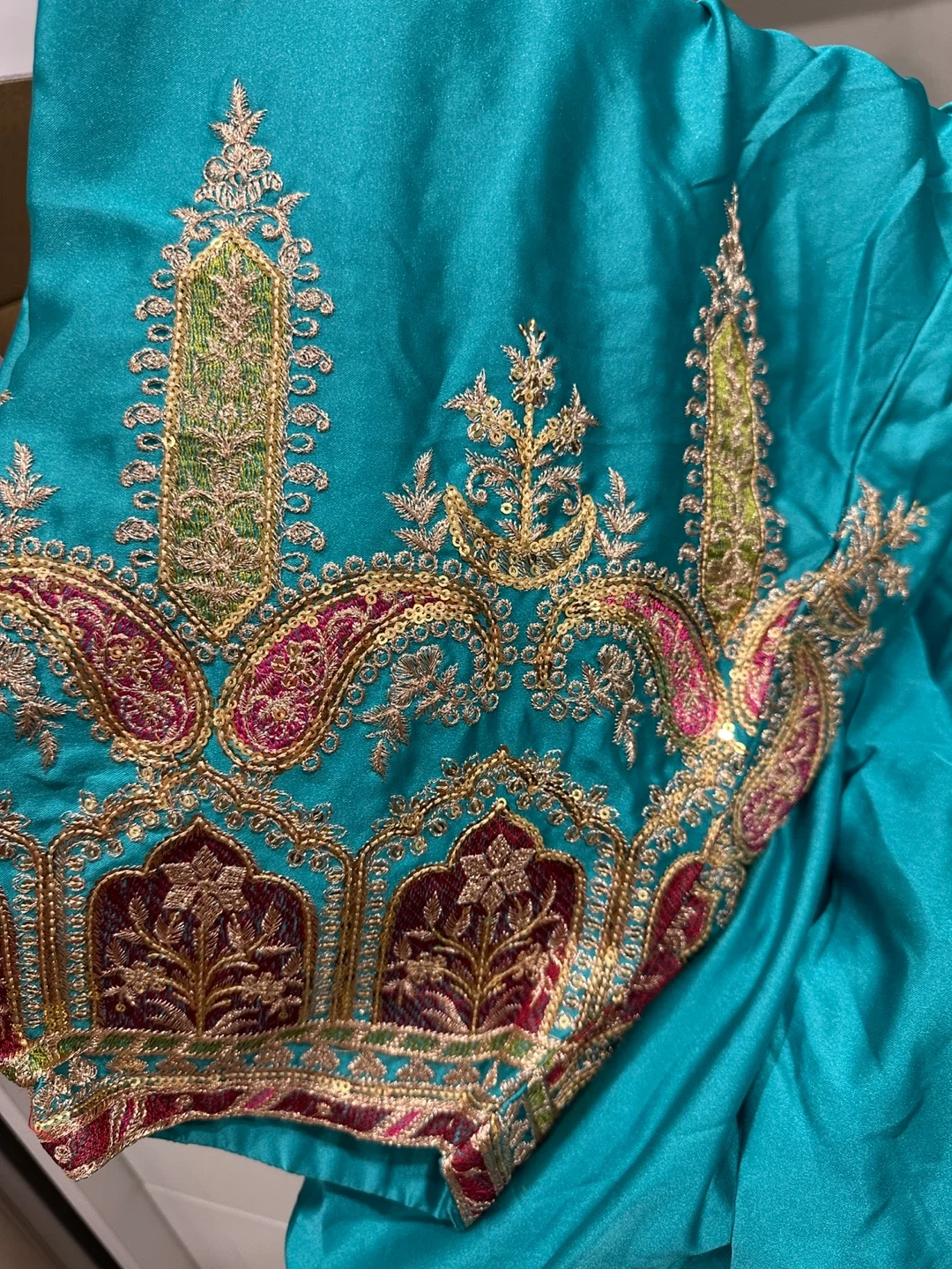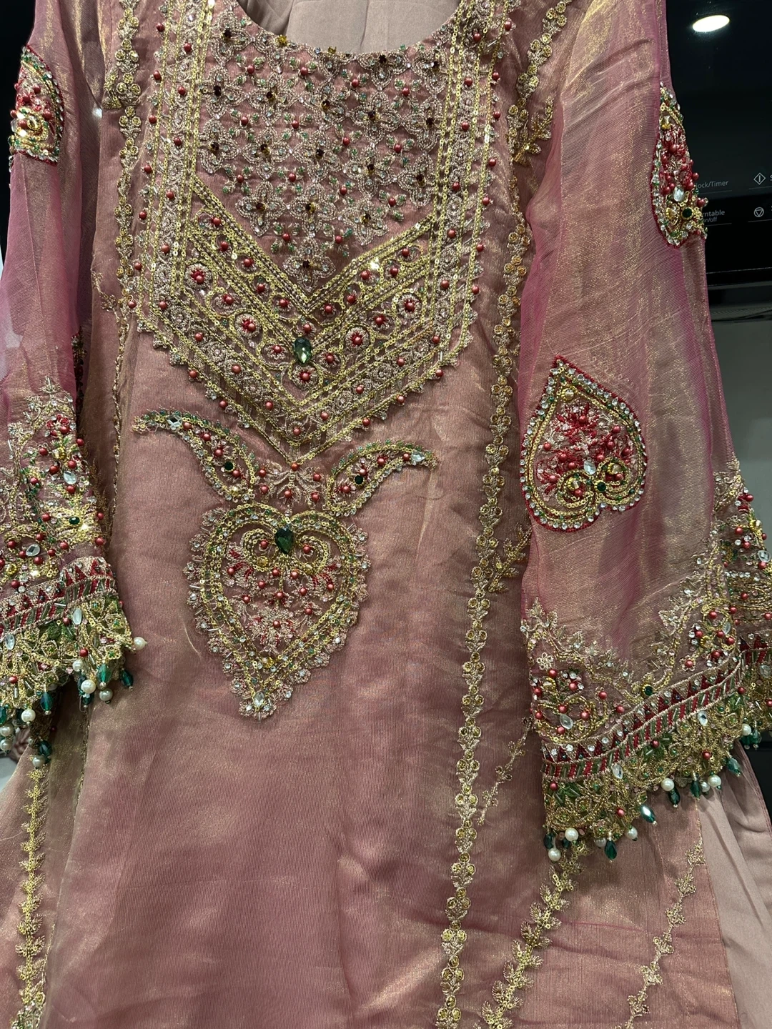 This is a beautifully crafted Pakistani dress with intricate embroidery and beadwork. The fabric has a lovely shimmer, perfect for special occasions. It's designed with ornate detailing on the neckline, sleeves, and hem.