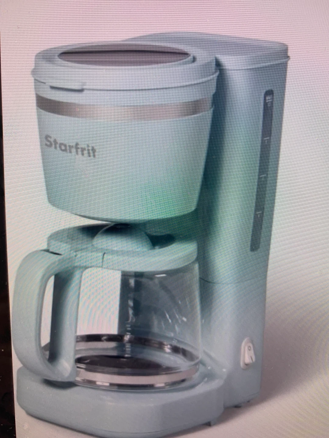 This is a Starfrit coffee maker in a light blue colour. It has a glass carafe and a water level indicator on the side. It's a standard drip coffee maker.