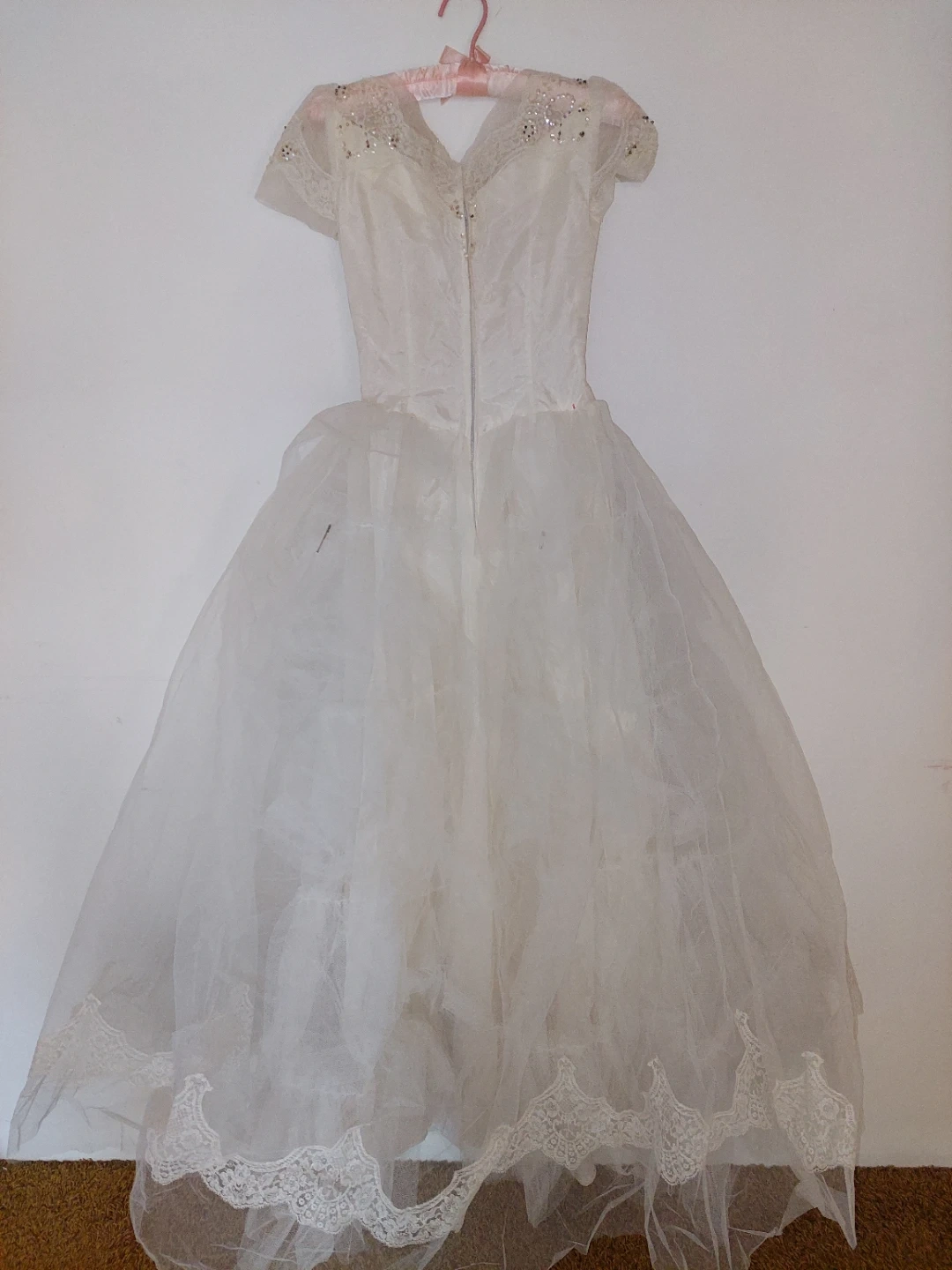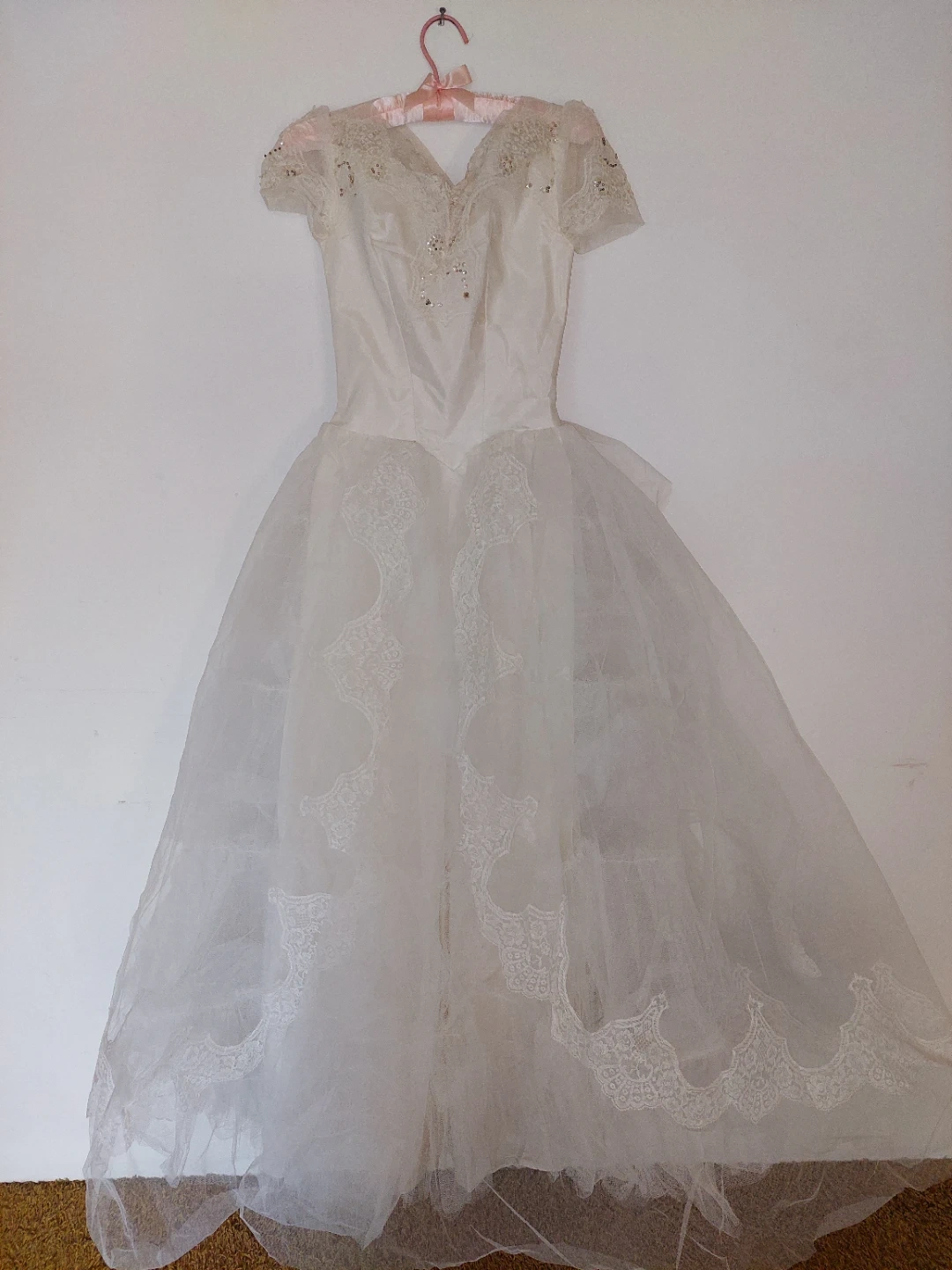 This elegant white wedding dress features a sweetheart neckline with delicate beading and cap sleeves. The bodice is smooth satin, flowing into a full tulle skirt adorned with lace appliques and a lace-trimmed hem. It's designed with a zipper closure at the back.