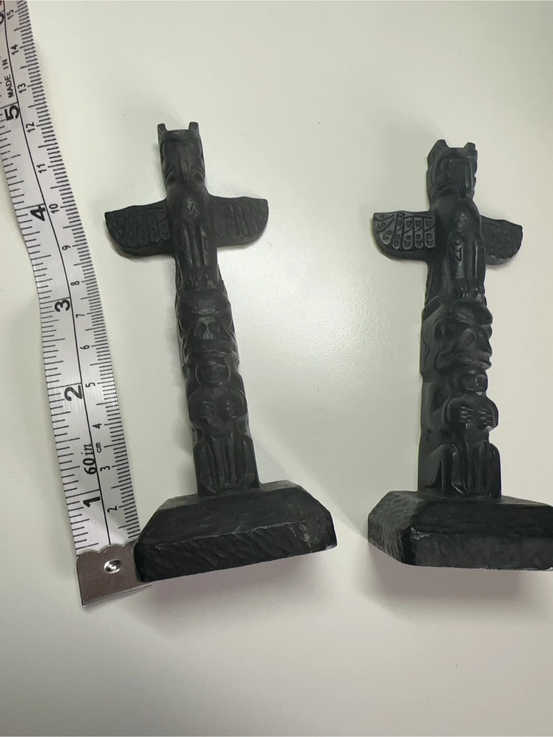 A set of two black wooden totem pole figurines. The taller one measures approximately 7 inches in height, and the shorter one is about 5.5 inches. They're carved with intricate details depicting various figures. These would make a nice decorative accent for a shelf or desk.