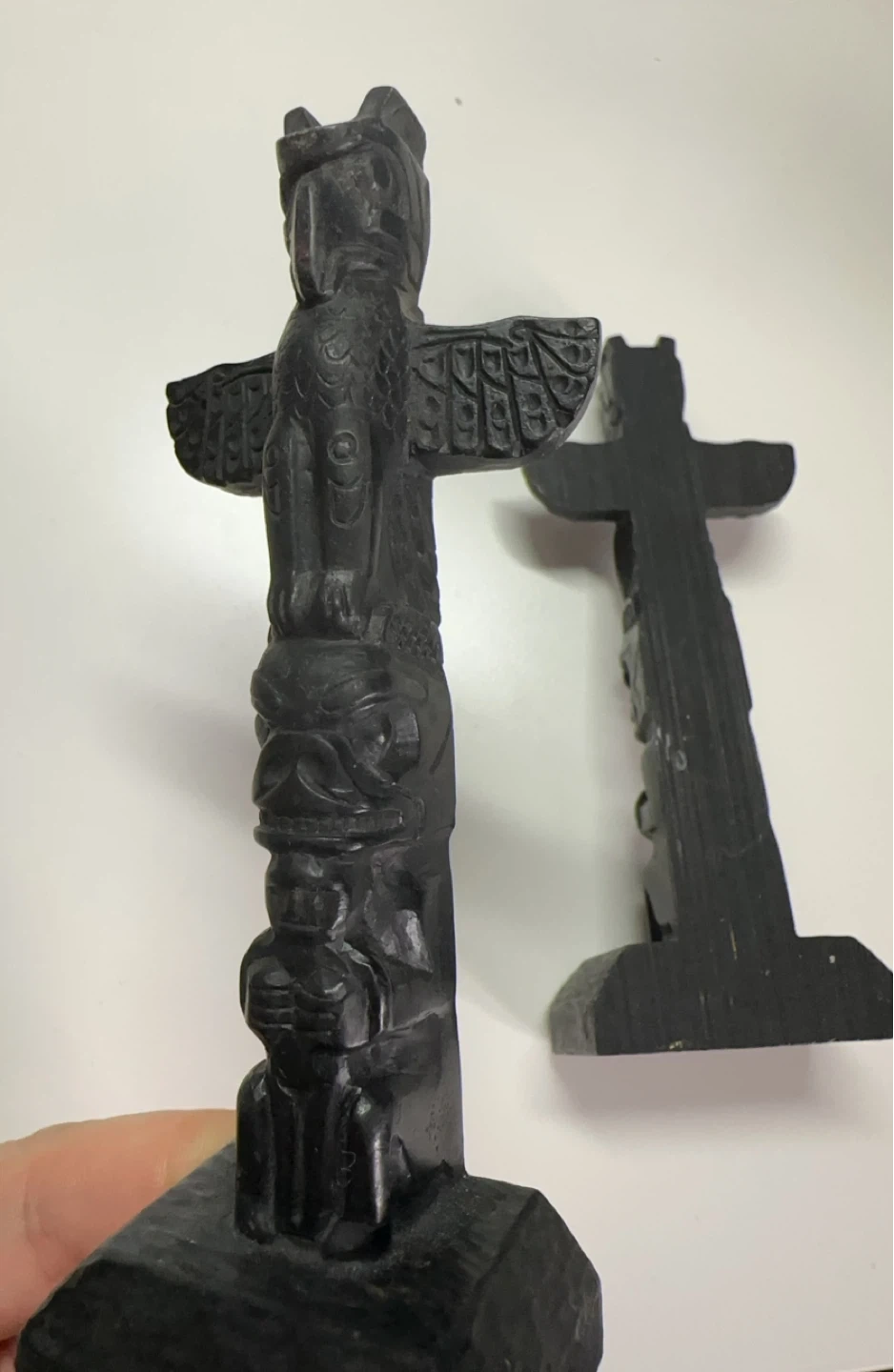Two Black Wooden Totem Pole Figurines