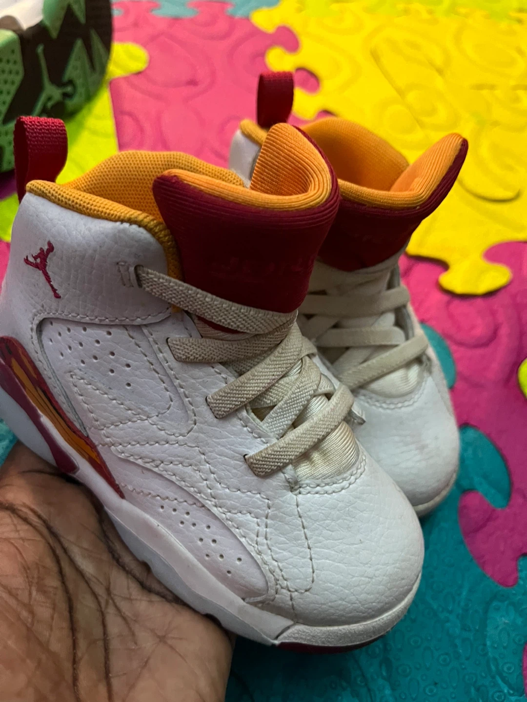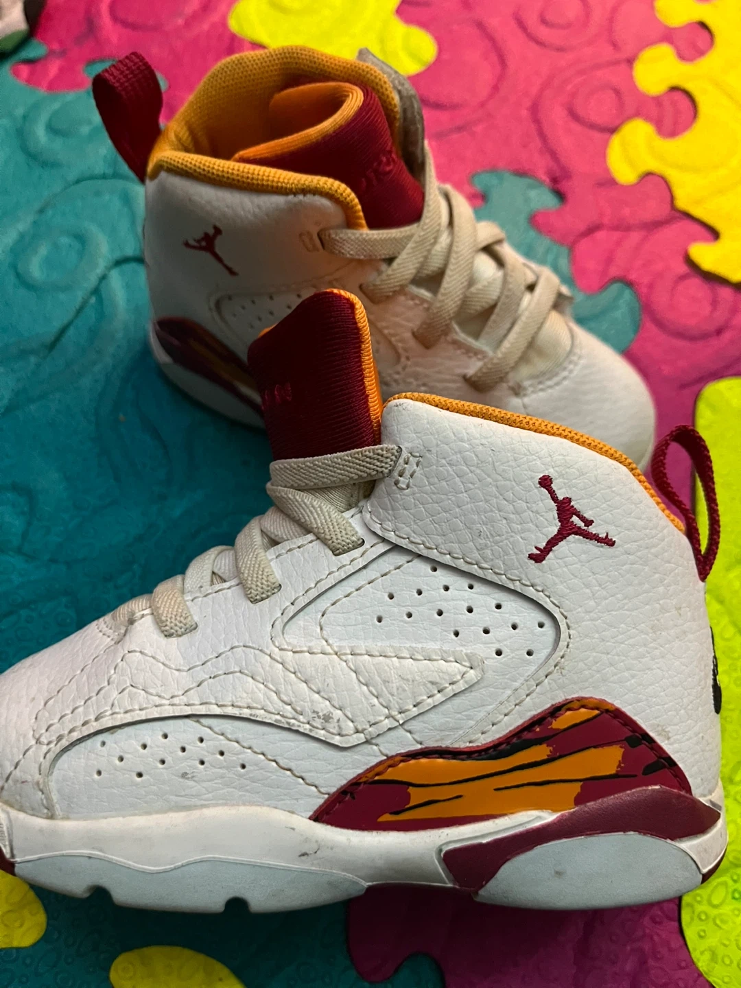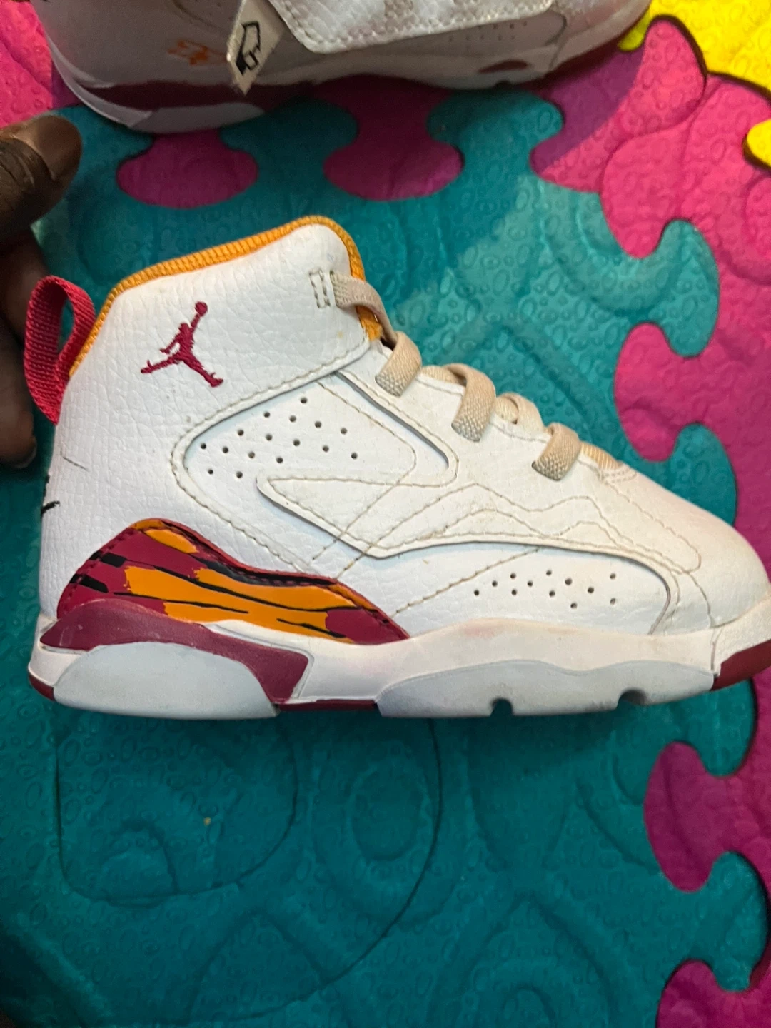 White Nike Air Jordan toddler shoes with red, orange, and yellow accents. These sneakers feature the iconic Jumpman logo and Nike swoosh. Perfect for little ones learning to walk or run! Size 7C.