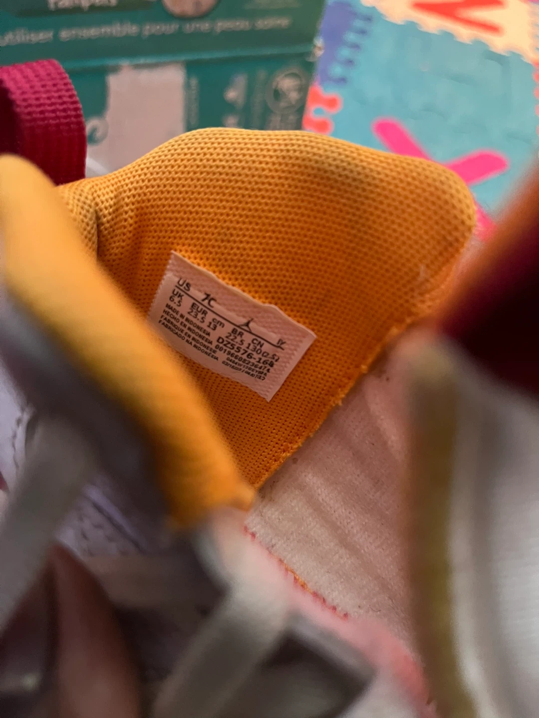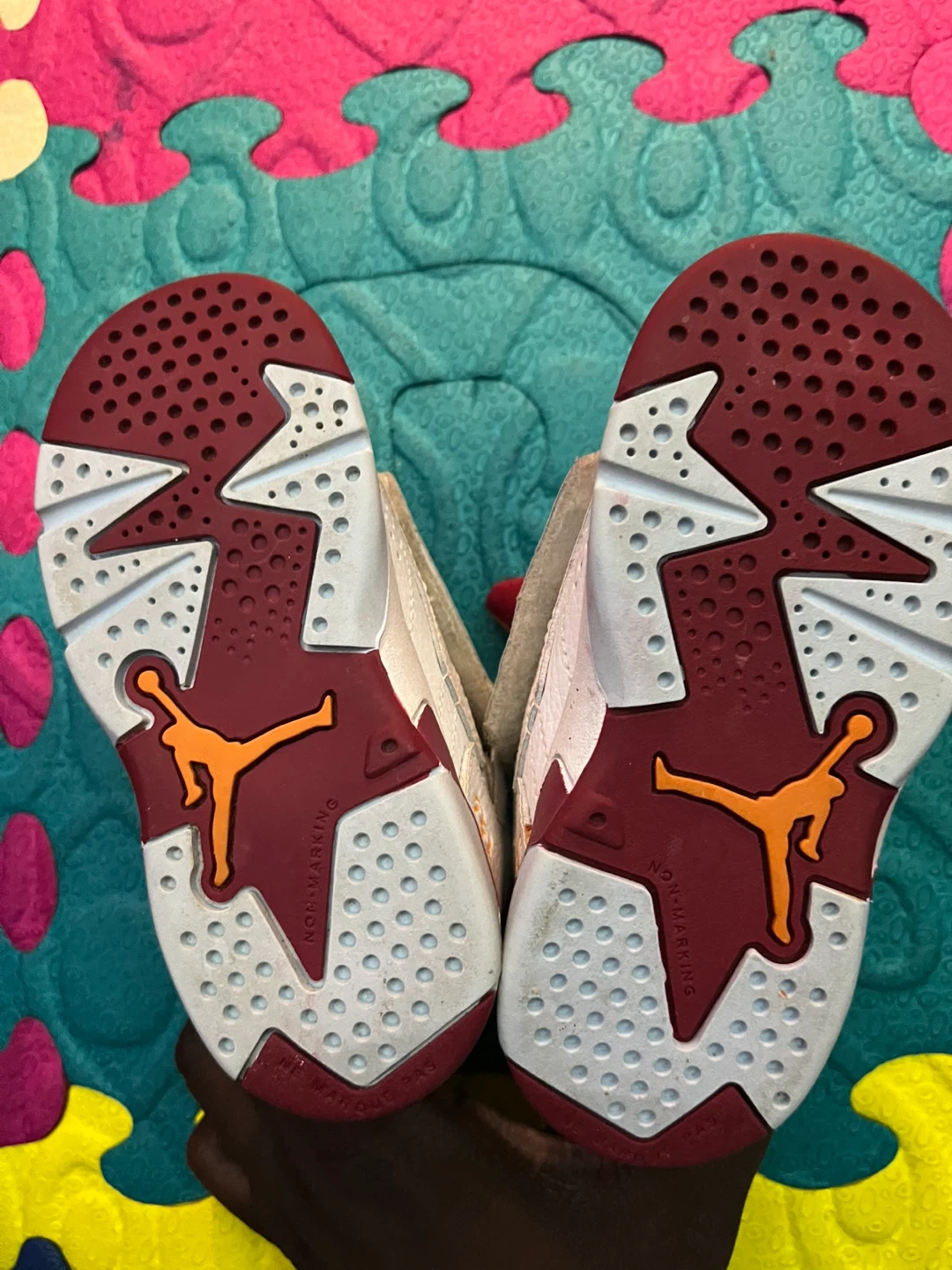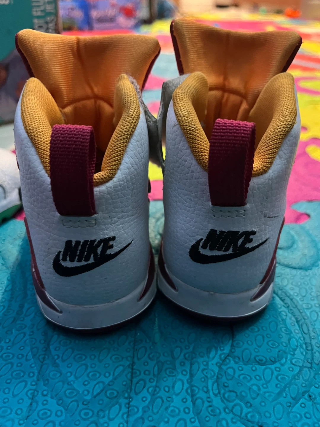 White Nike Air Jordan toddler shoes with red, orange, and yellow accents. These sneakers feature the iconic Jumpman logo and Nike swoosh. Perfect for little ones learning to walk or run! Size 7C.