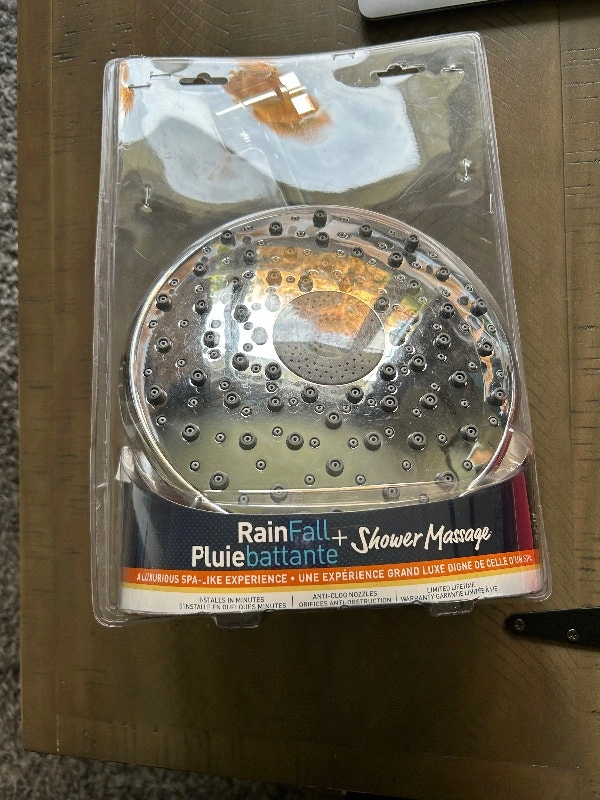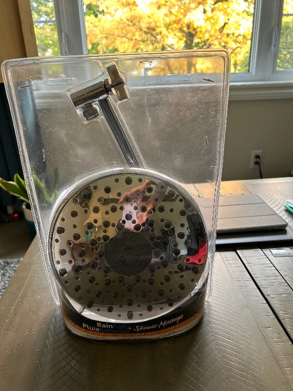 Never used. In original packaging, but has been opened. Chrome, 8” diameter head. Provides a range of showering sensations from rainfall to a relaxing pulsating massage. Adjustable height, anti-clog nozzles, easy installation. Pickup in Brampton, near Queen and Kennedy.