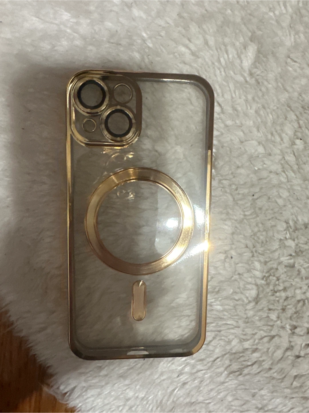 This is a clear phone case with a gold bumper. It features a magnetic ring for MagSafe compatibility. The case has cutouts for the camera lenses.