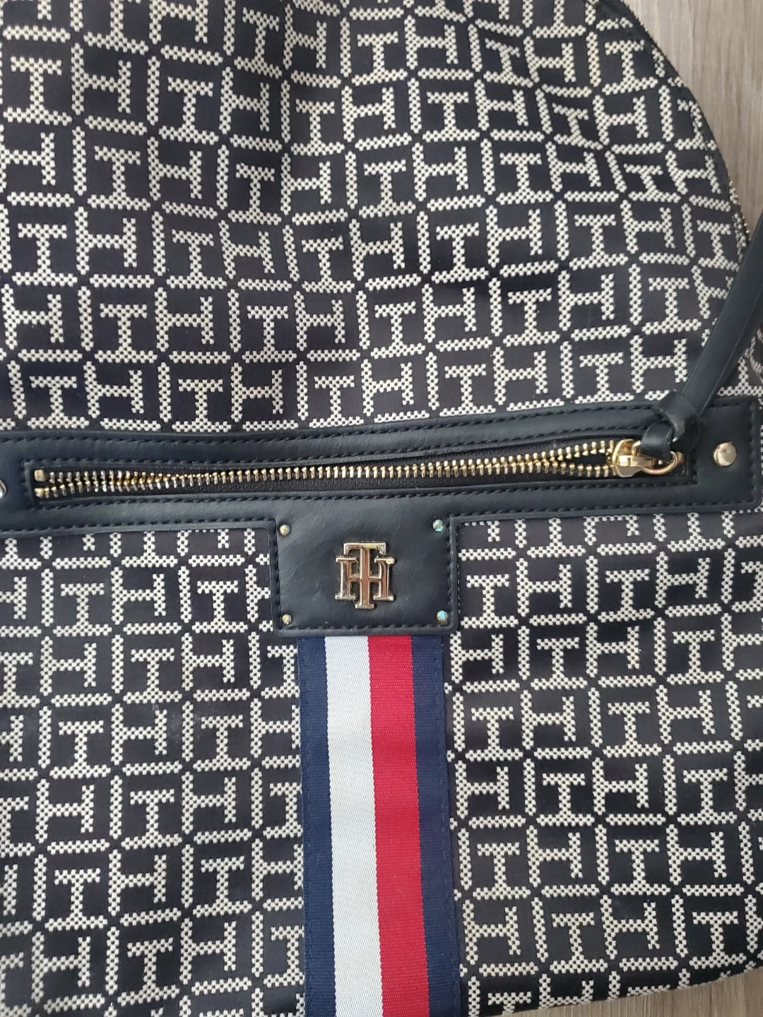 This is a Tommy Hilfiger backpack with the classic TH monogram pattern. It features a front zippered pocket and a spacious main compartment. The iconic Tommy Hilfiger stripe detail is on the front. It's a stylish option for everyday use!