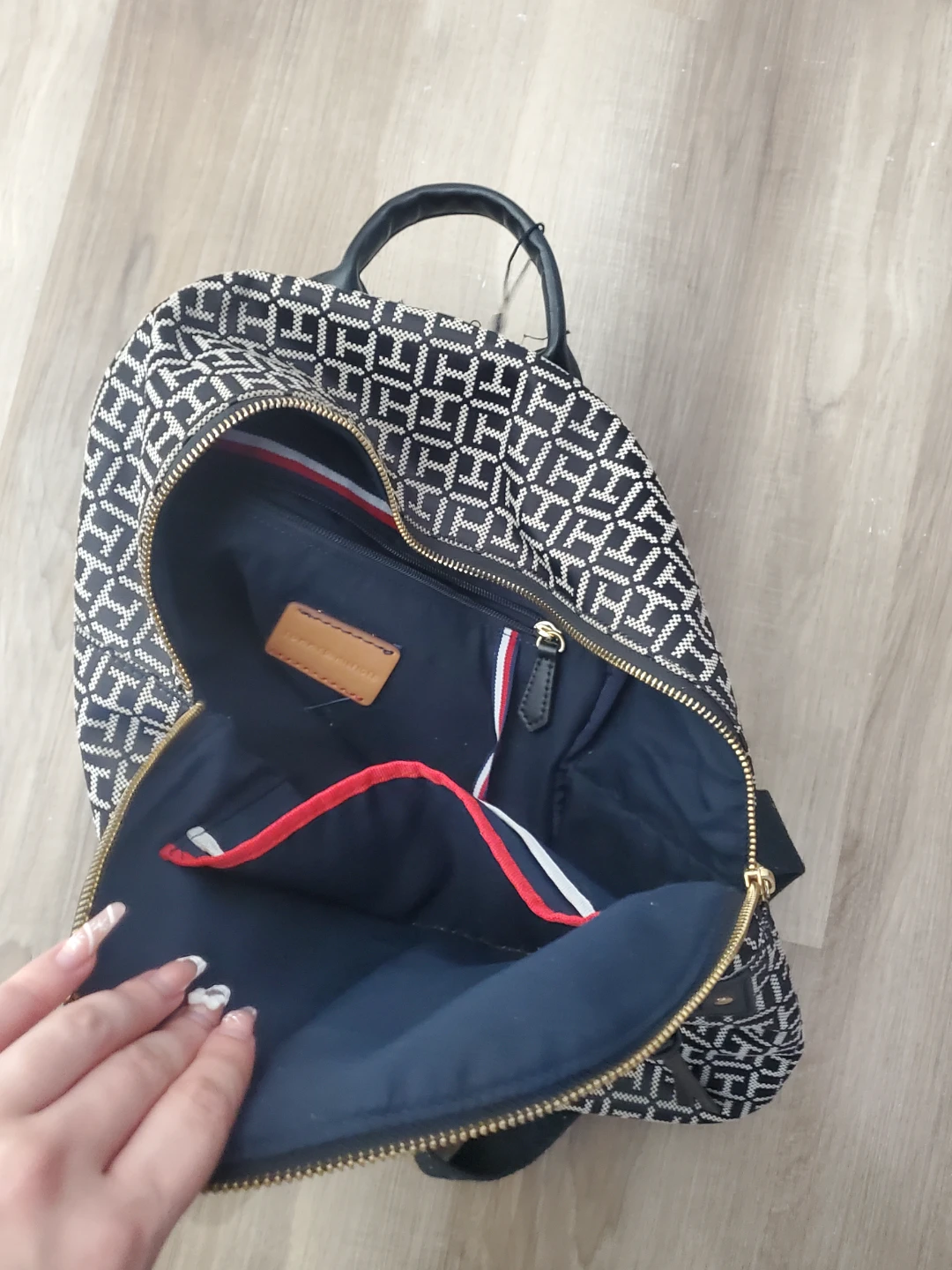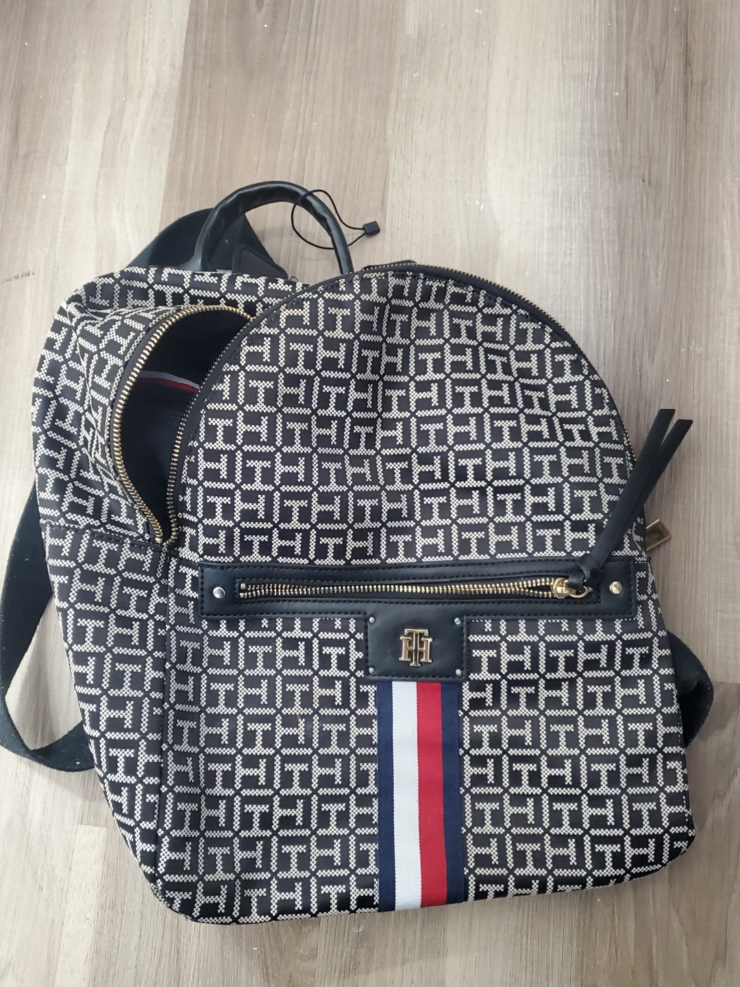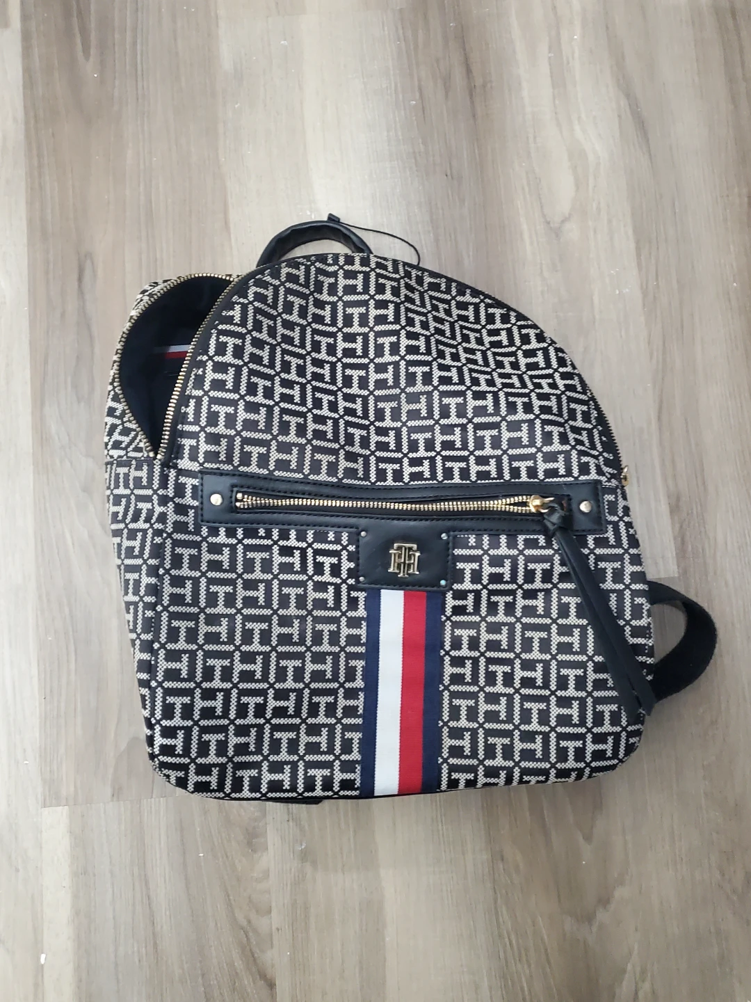 This is a Tommy Hilfiger backpack with the classic TH monogram pattern. It features a front zippered pocket and a spacious main compartment. The iconic Tommy Hilfiger stripe detail is on the front. It's a stylish option for everyday use!