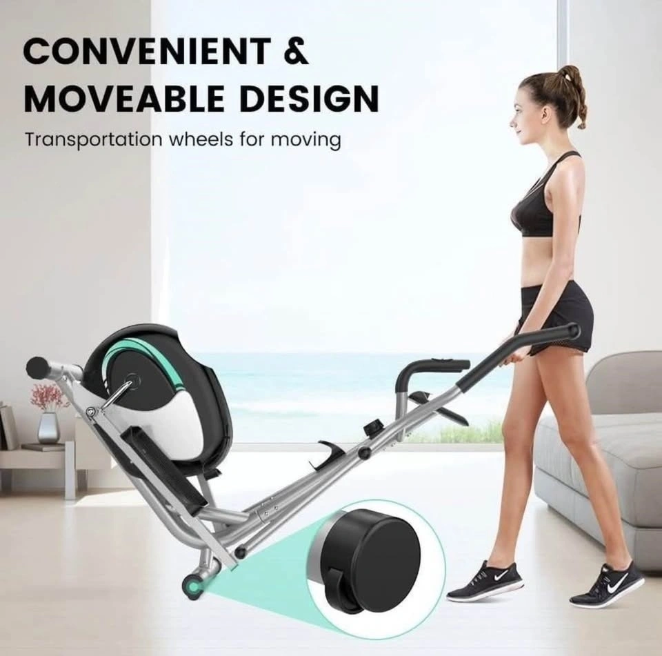 It has 8 adjustable resistance levels for a customizable low-impact, high-cardio workout. The sturdy steel frame supports up to 265 lbs and is suitable for users between 4'9" and 6'1". It includes dual handlebars with built-in heart rate sensors, an LCD monitor tracking time, speed, distance, calories, and pulse, plus a device holder. The machine also has transportation wheels for easy moving and a compact design for storage.