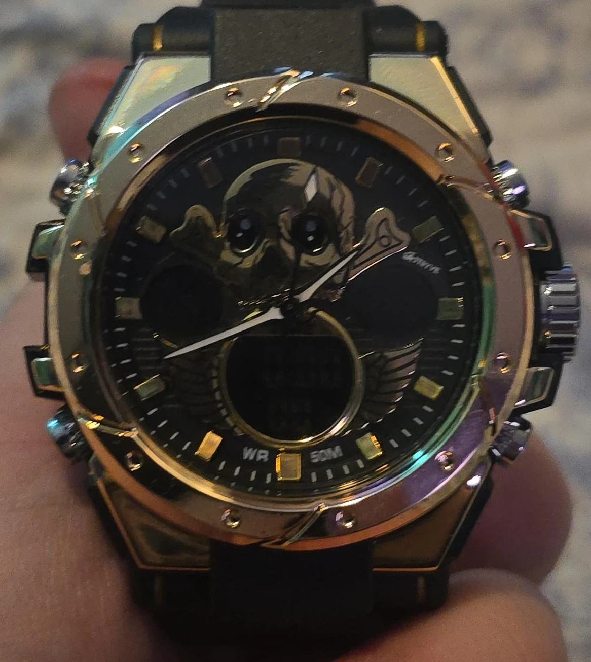 Cool Amuawa watch with a skull design on the face! It features a gold-tone accent and a digital display. The watch is in great condition and ready to wear