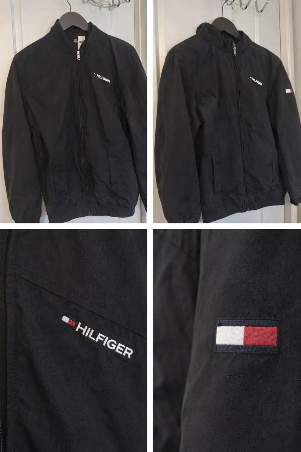 This is a black Tommy Hilfiger bomber jacket. It features the Tommy Hilfiger logo embroidered on the chest and a flag logo on the sleeve. Zipper closure with front pockets.
