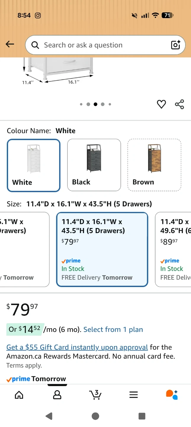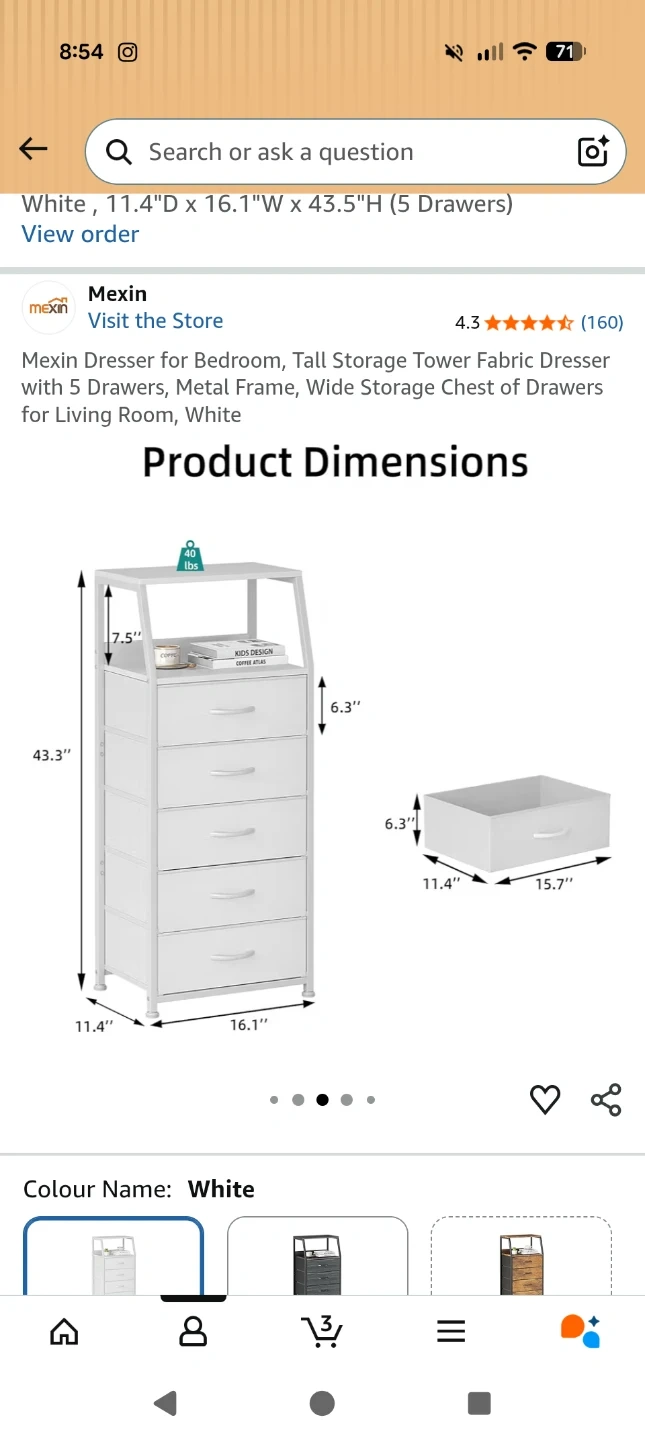 White Moxin dresser with 5 fabric drawers and a metal frame. Dimensions are 11.4"D x 16.1"W x 43.3"H. It provides ample storage space for bedrooms or living rooms.