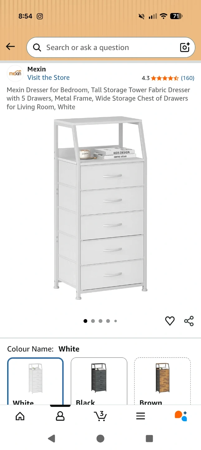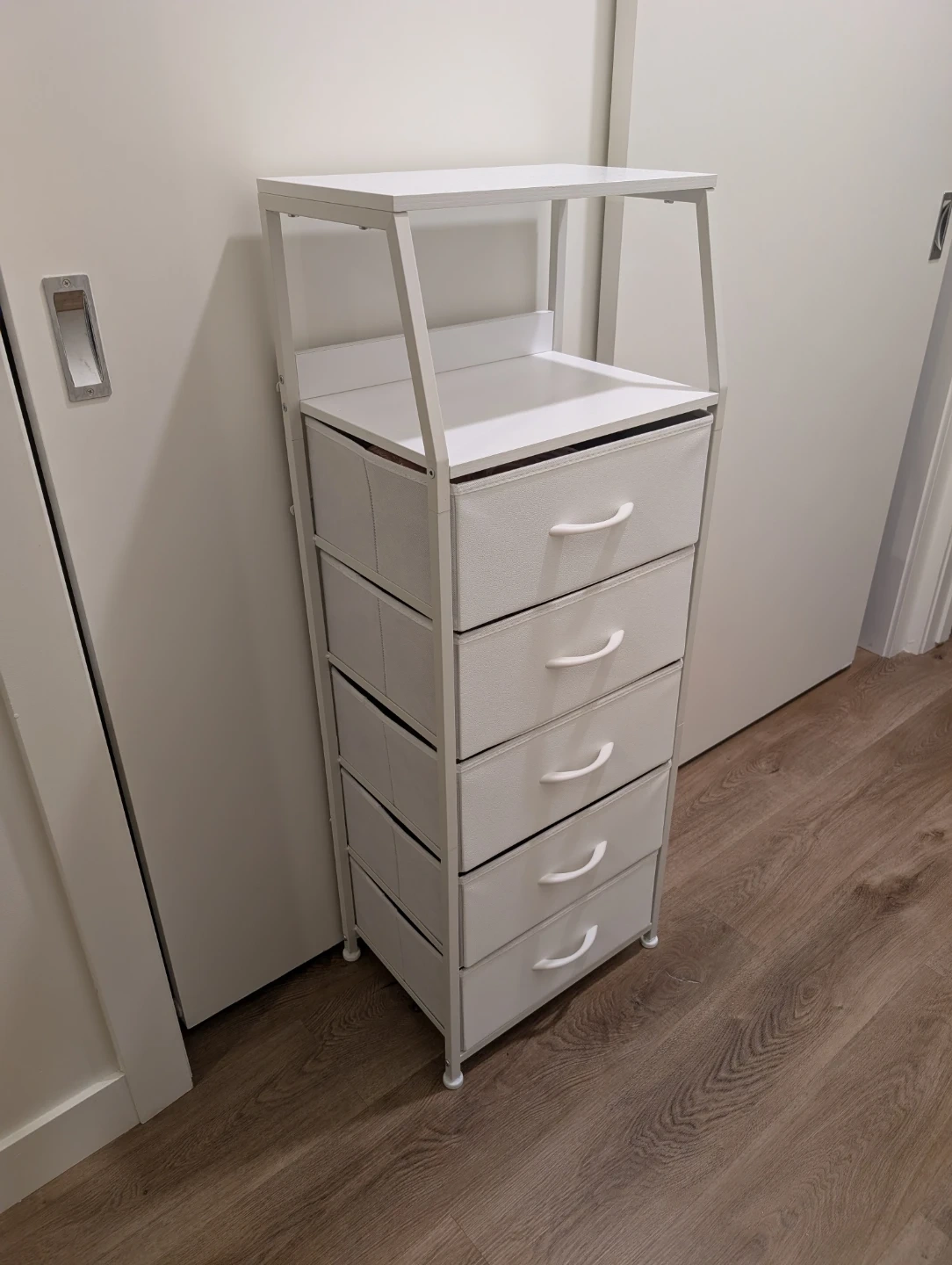 White Moxin dresser with 5 fabric drawers and a metal frame. Dimensions are 11.4"D x 16.1"W x 43.3"H. It provides ample storage space for bedrooms or living rooms.