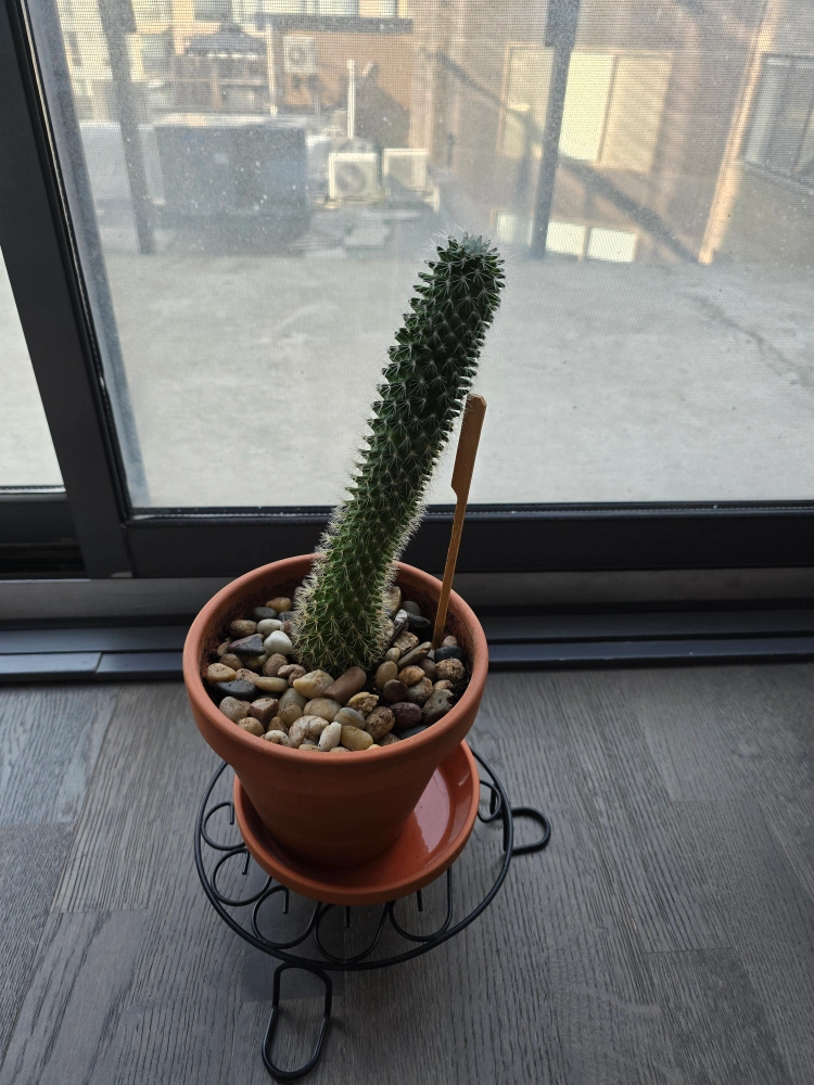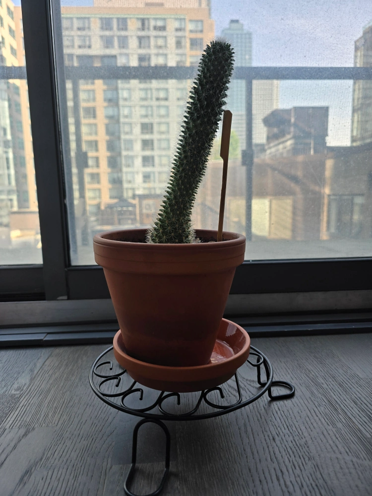 A cute cactus in a terracotta pot! It comes with a matching saucer and a decorative metal stand. Perfect for adding a touch of green to your home or office