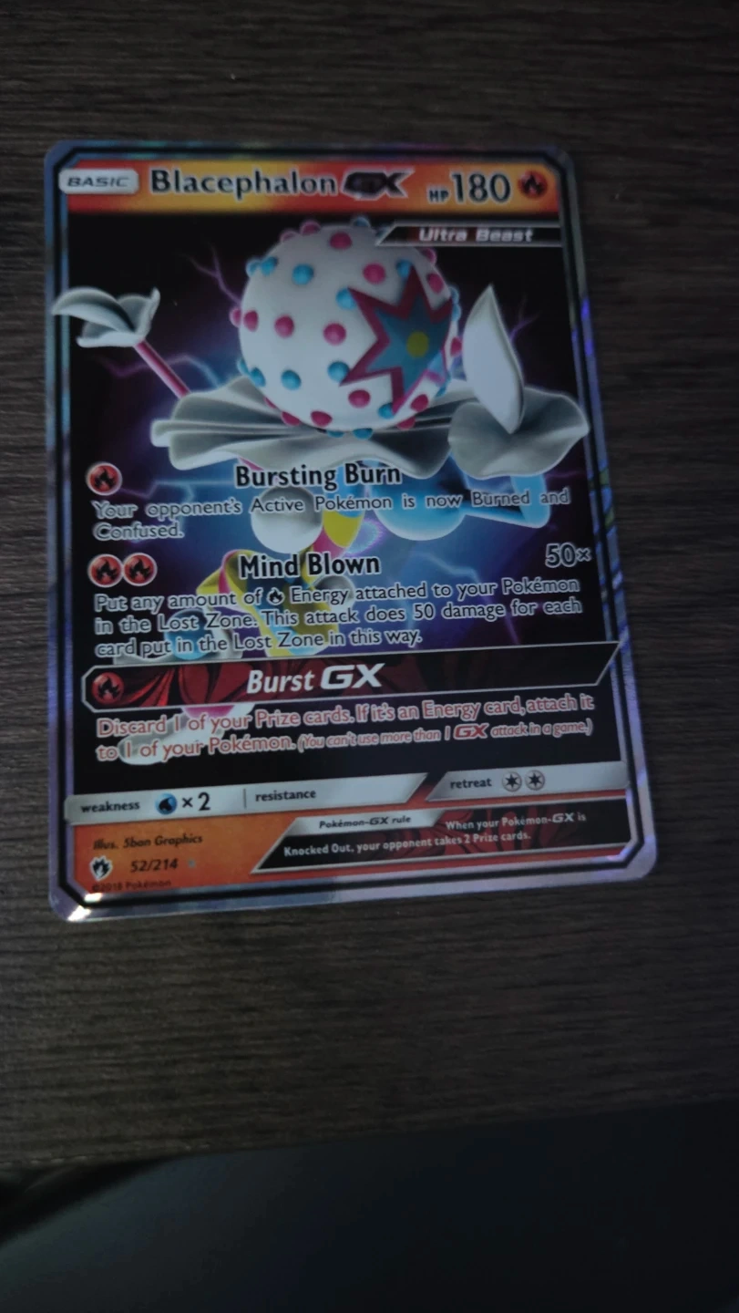 Selling a Blacephalon GX Pokemon card. It has a weakness of x2 and a resistance. The card is numbered 52/214.