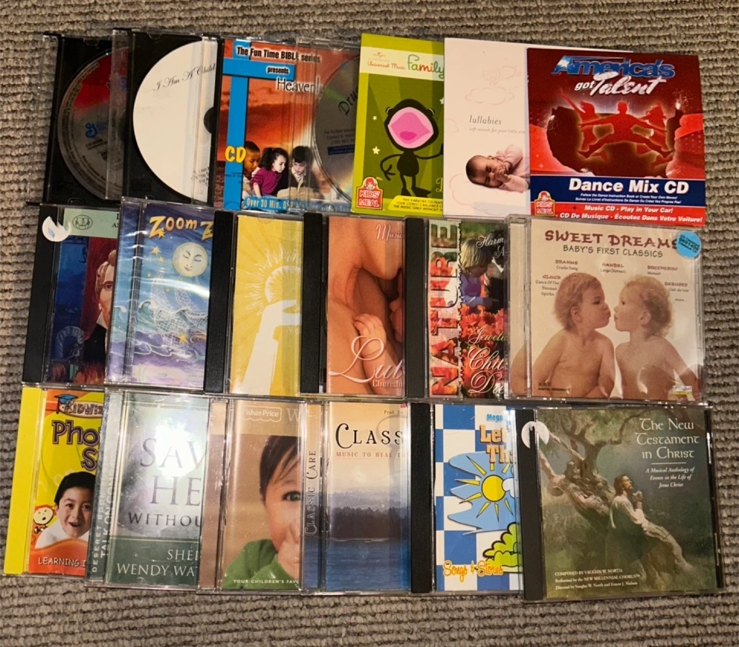 This lot includes 19 CDs covering various genres like lullabies, pop music, children's educational content, and religious themes. Titles include 'America's Got Talent Dance Mix CD', 'Sweet Dreams Baby's First Classics', and 'The New Testament in Christ'. These discs are suitable for learning and entertainment.