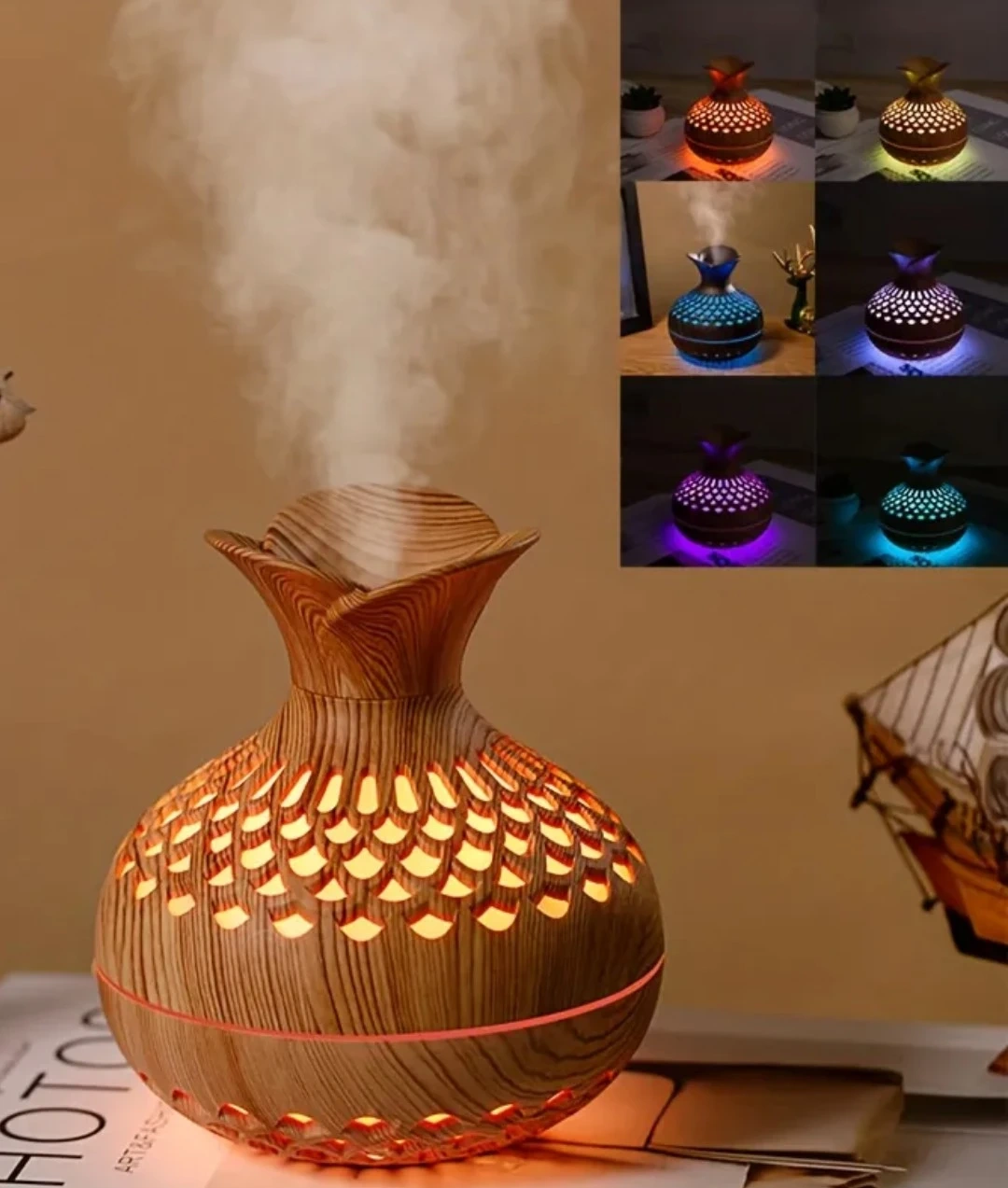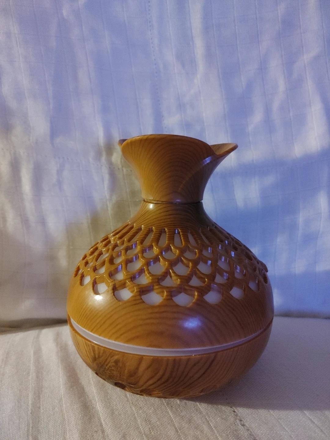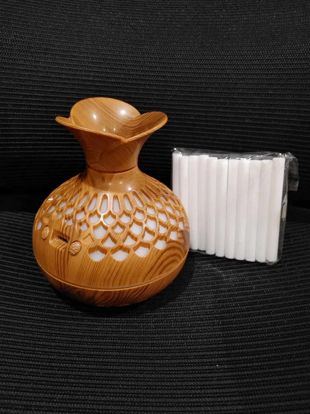 - aroma diffuser with unique wood grain pattern and a floral-inspired design.