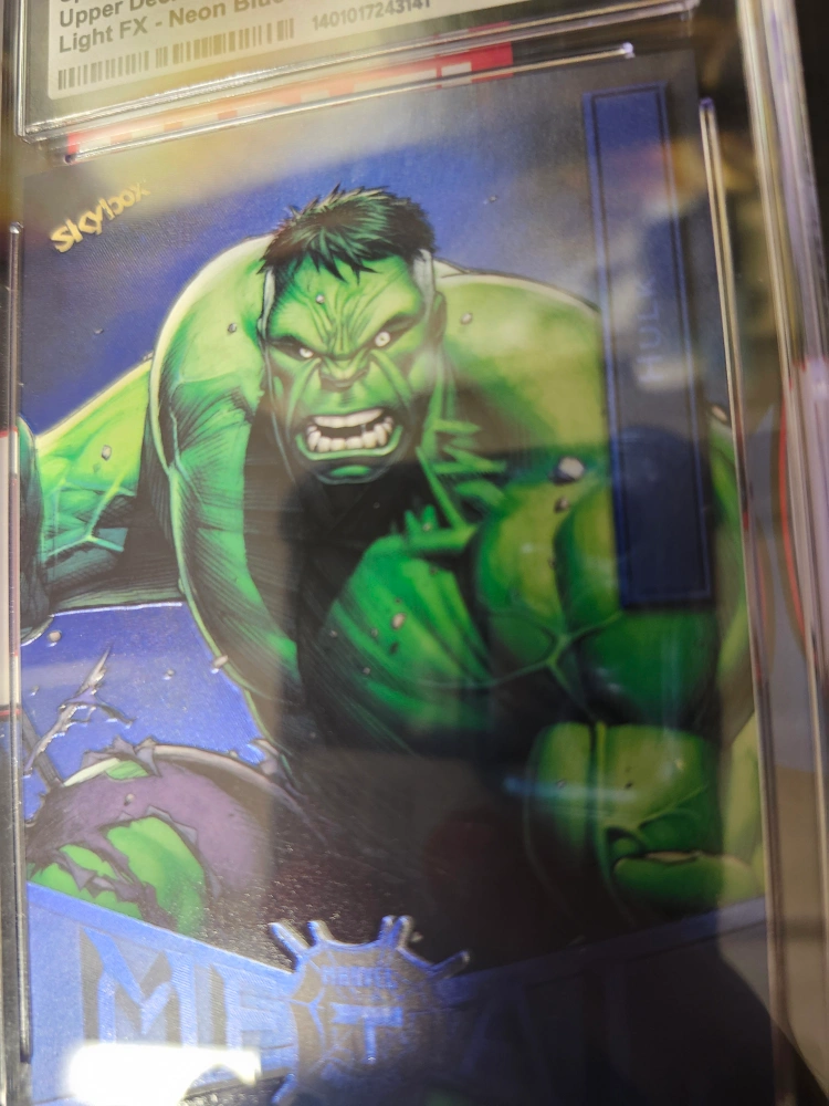 Selling a Hulk Spider-Man Metal (2022) Upper Deck #33 card. It's graded MINT+ 9.5 by CGC. The card features a Light FX - Neon Blue design and is from the Skybox series. A great addition for any Marvel or Hulk collector!