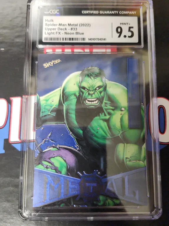 Selling a Hulk Spider-Man Metal (2022) Upper Deck #33 card. It's graded MINT+ 9.5 by CGC. The card features a Light FX - Neon Blue design and is from the Skybox series. A great addition for any Marvel or Hulk collector!
