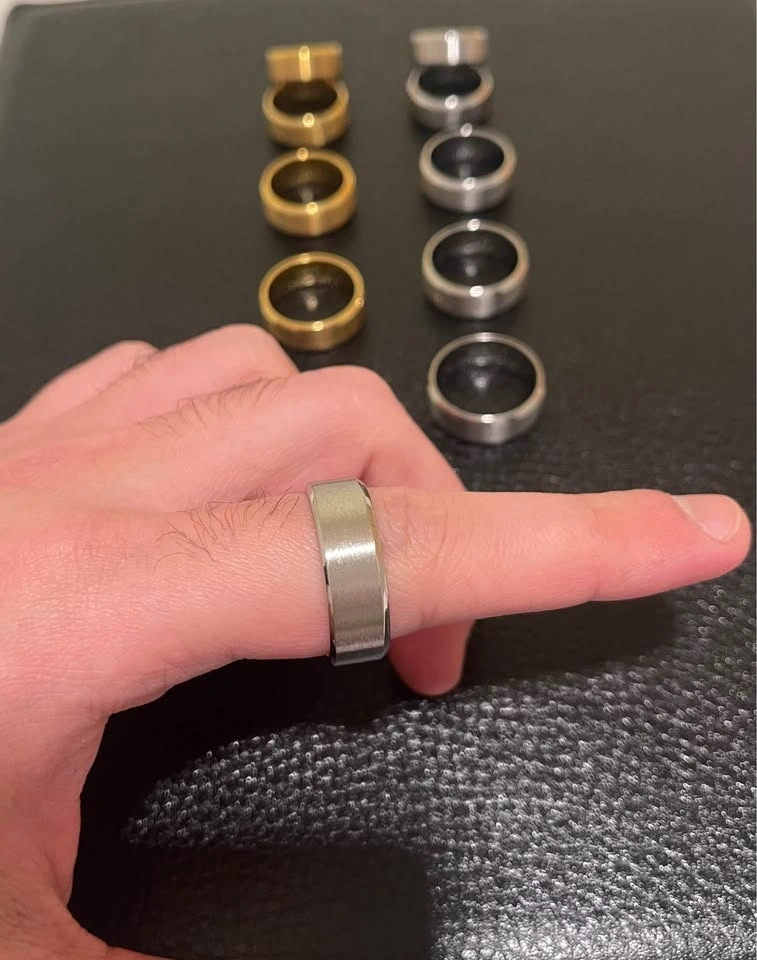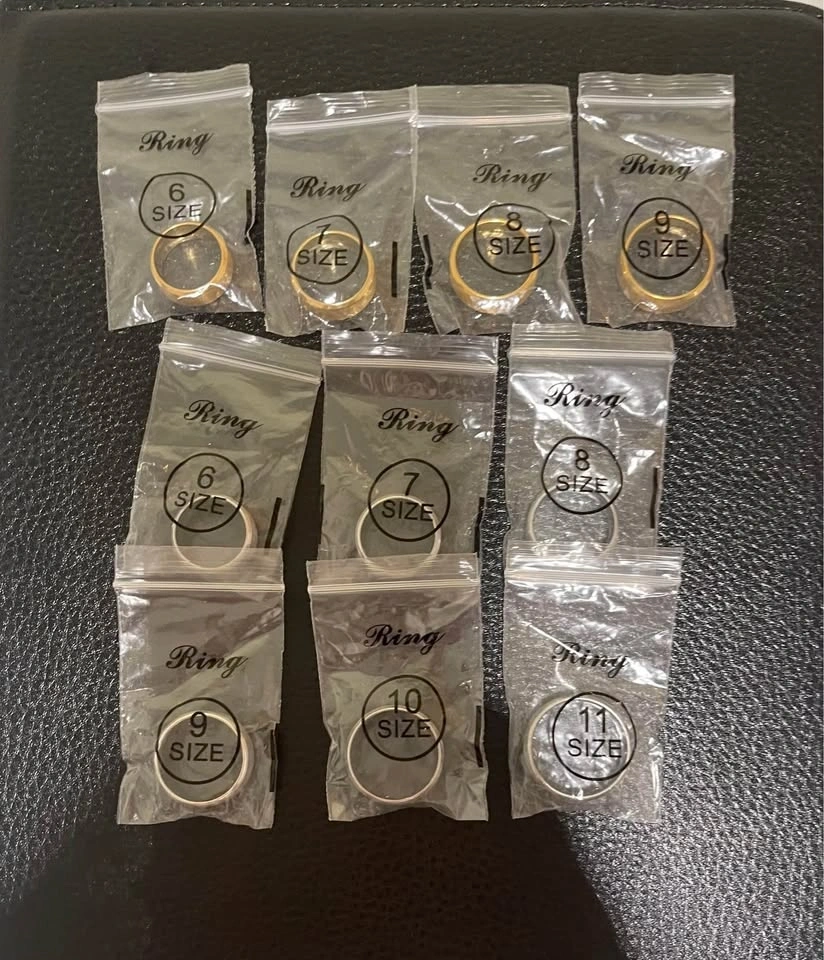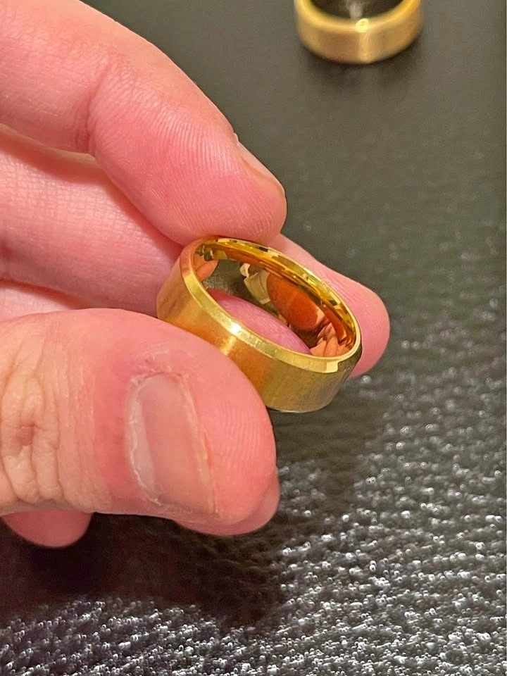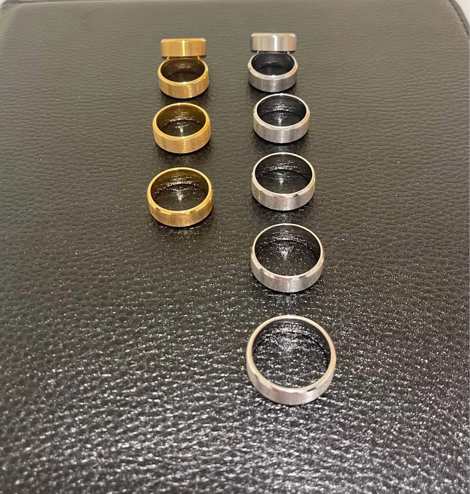 18k gold plated and silver rings. Gold sizes available are 6, 7, 8. Silver sizes available are 6, 7, 8, 10, and 11. These have a smooth polished finish and beveled edges. Price is $10 each.