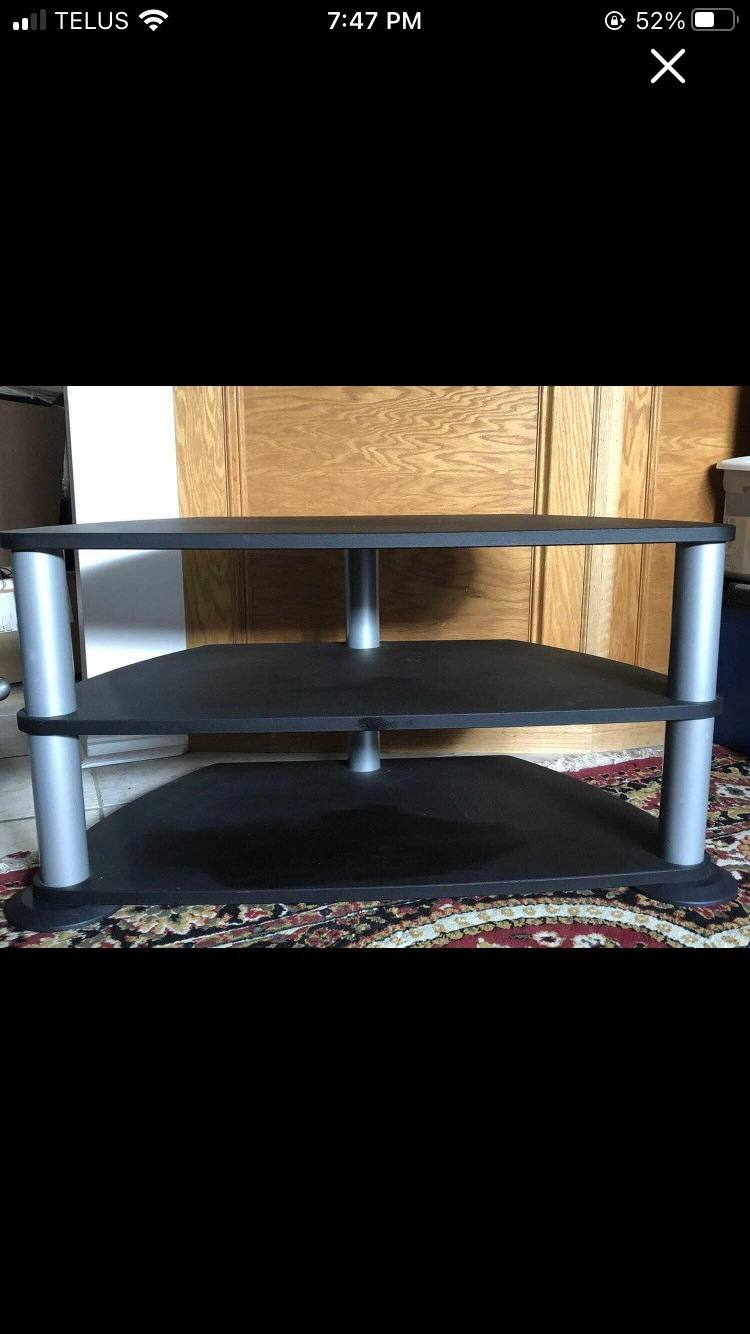 3 tier unit. Shelves are wood, legs are metal. Sturdy, excellent condition.
