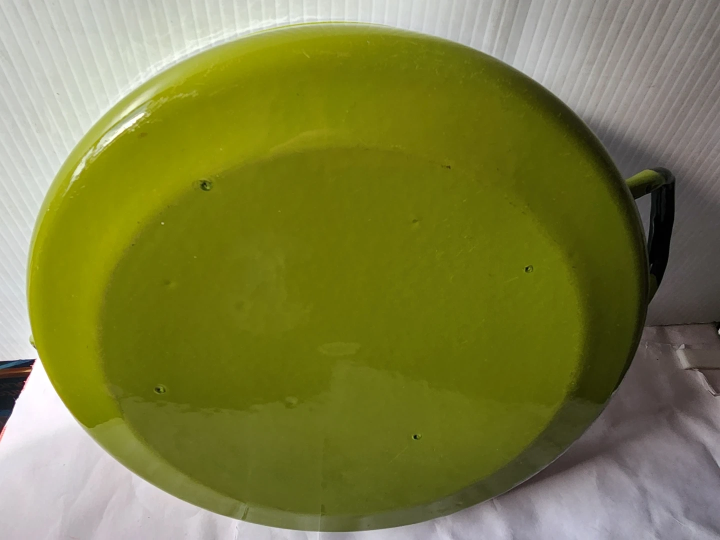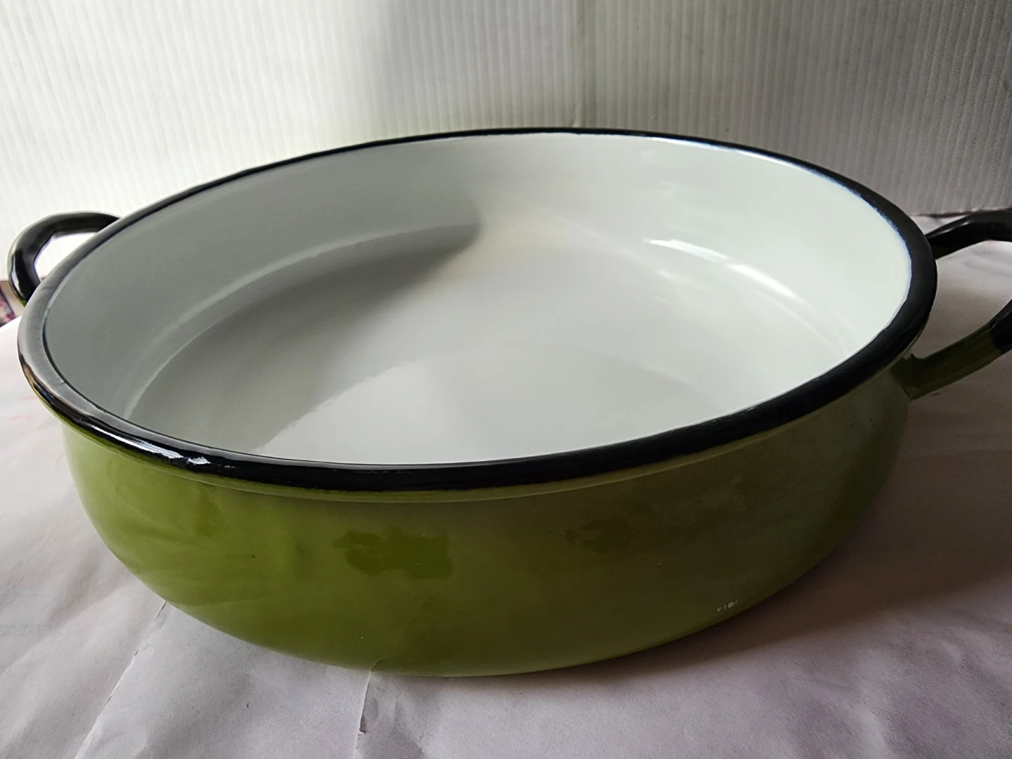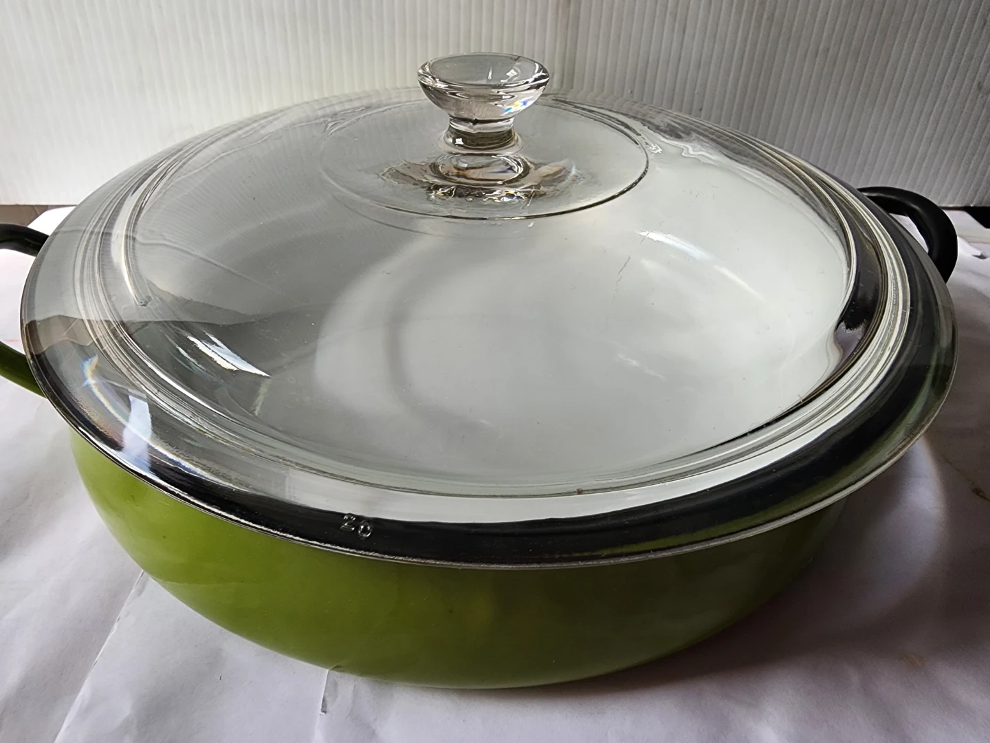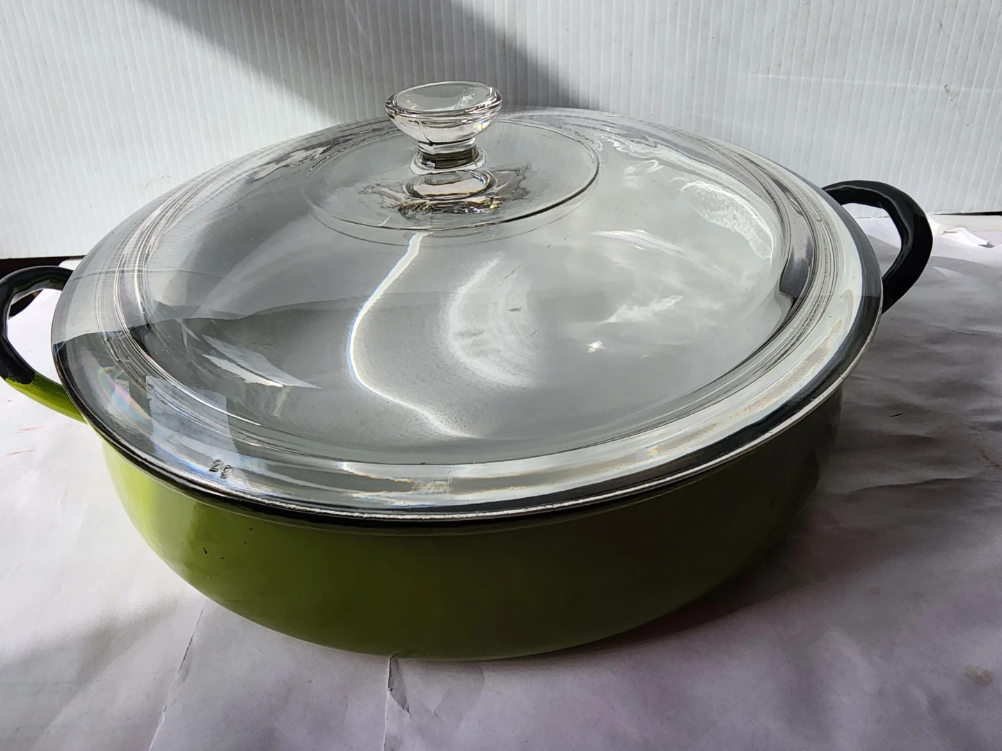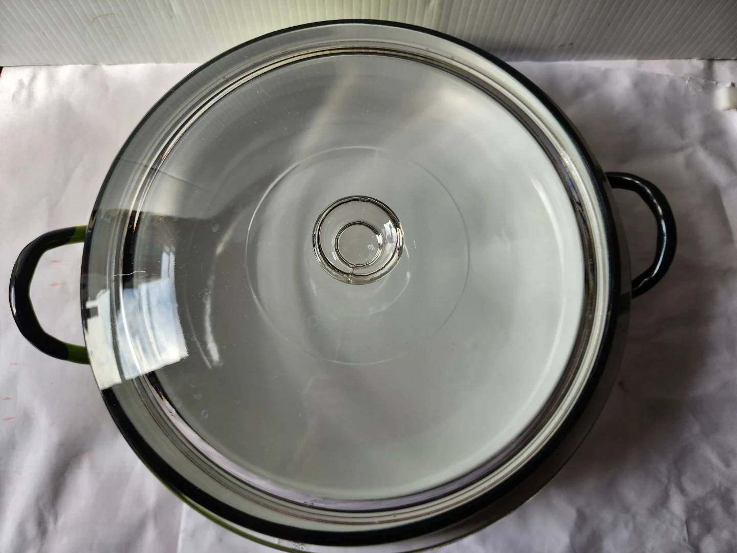 This is a large enamel pot with a white interior and a green exterior. It comes with a clear heavy glass lid. This pot has two black handles for easy carrying.