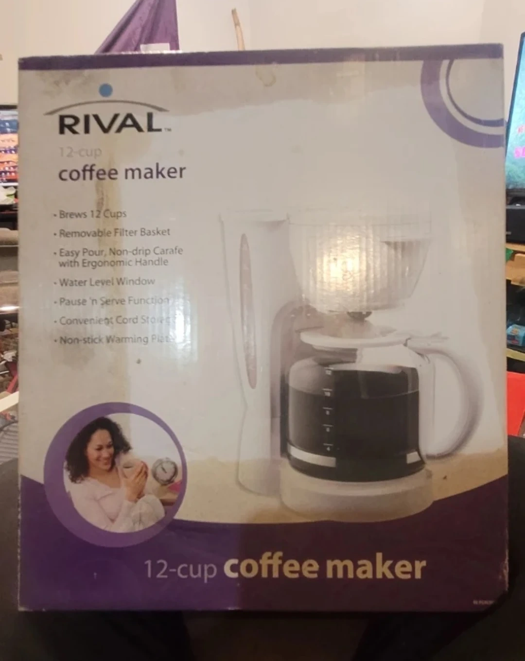 This never used in box RIVAL coffee maker brews 12 cups and features a removable filter basket. It has an easy pour, non-drip carafe with an ergonomic handle, a water level window, and a pause 'n serve function. It also includes convenient cord storage and a non-stick warming plate.