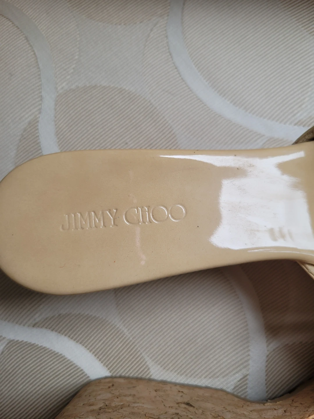 These stylish Jimmy Choo wedge sandals are a lovely beige colour with a patent finish. They feature criss-cross straps and a cork wedge heel. A chic addition to any summer wardrobe! Gently worn sz 37.5 Smokefree person/household.
