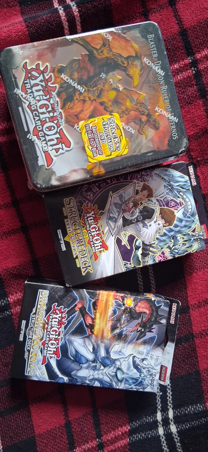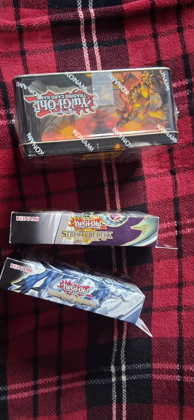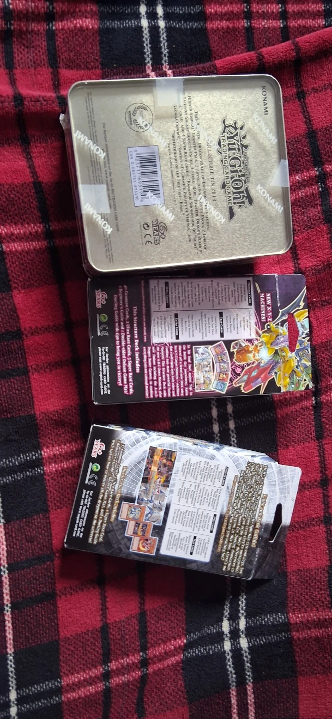 Collection of Yu-Gi-Oh! Trading Card Game items. Includes a tin, a Structure Deck, and a booster pack. All items are from Konami. These are great for collectors and players looking to expand their card game collection!