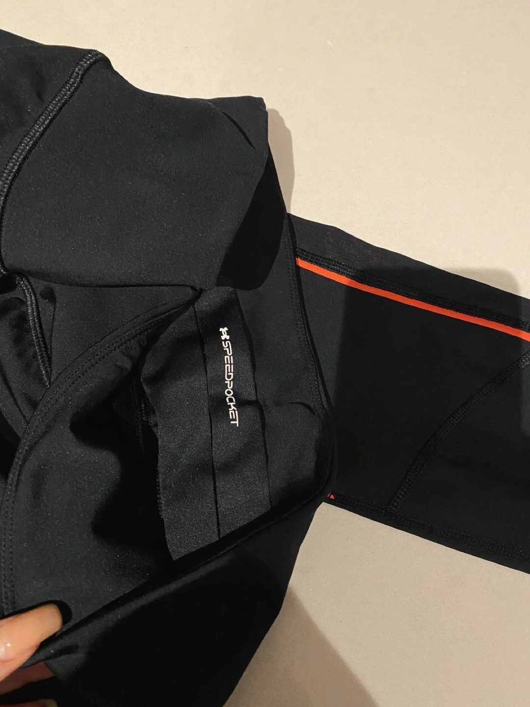 Under Armour women's 7/8 length running leggings. Black with orange accents. Features a built-in speed pocket. Great for workouts.