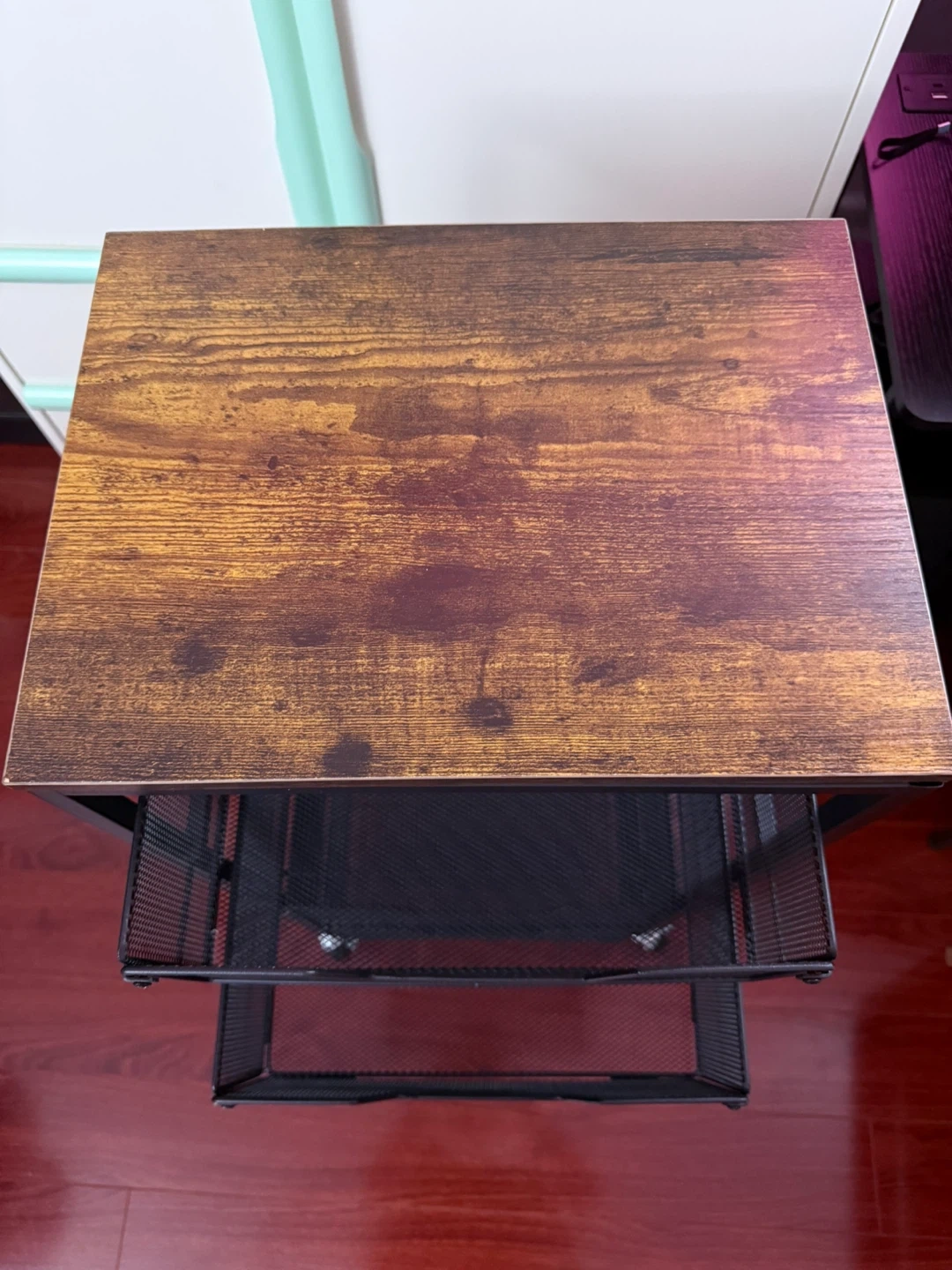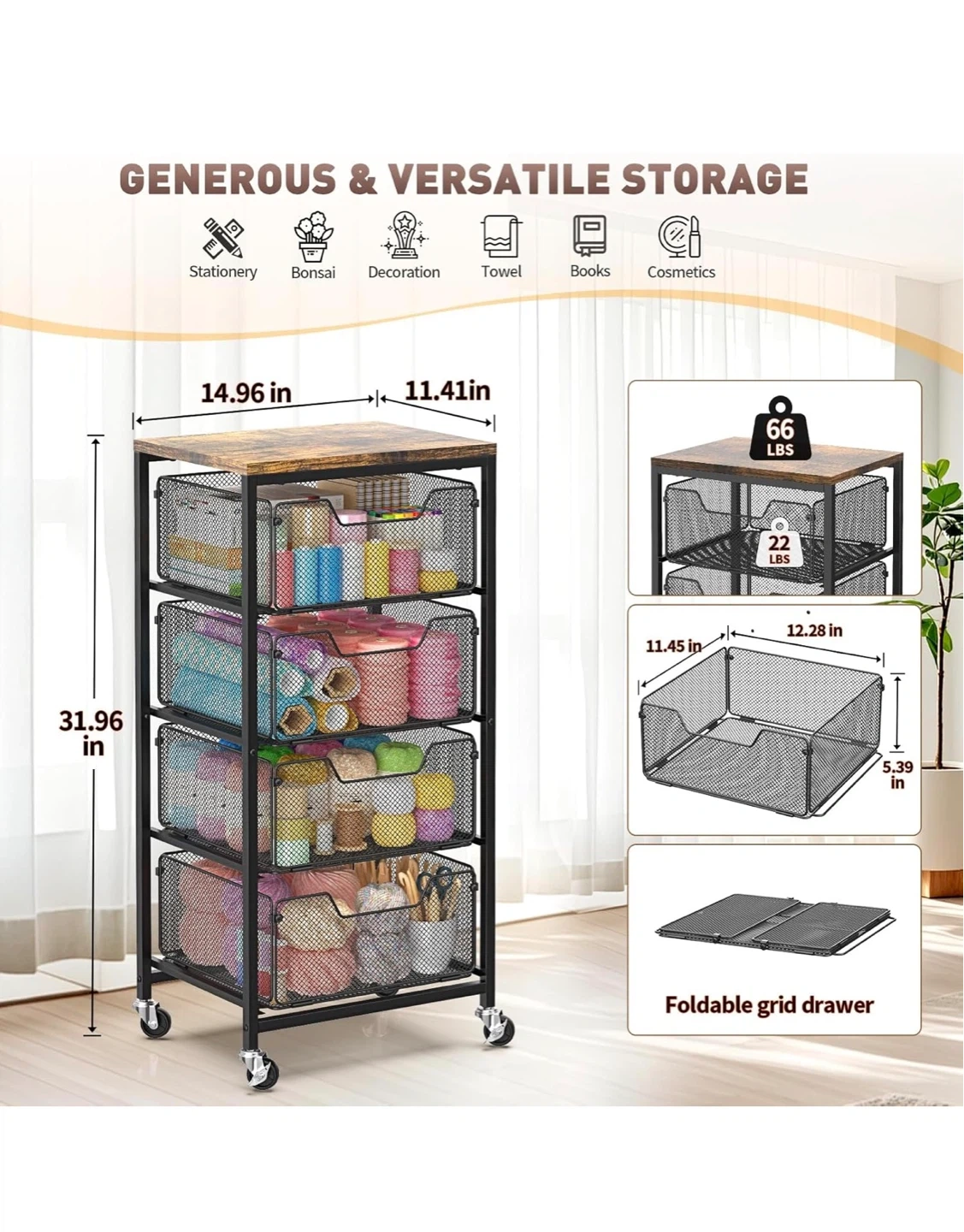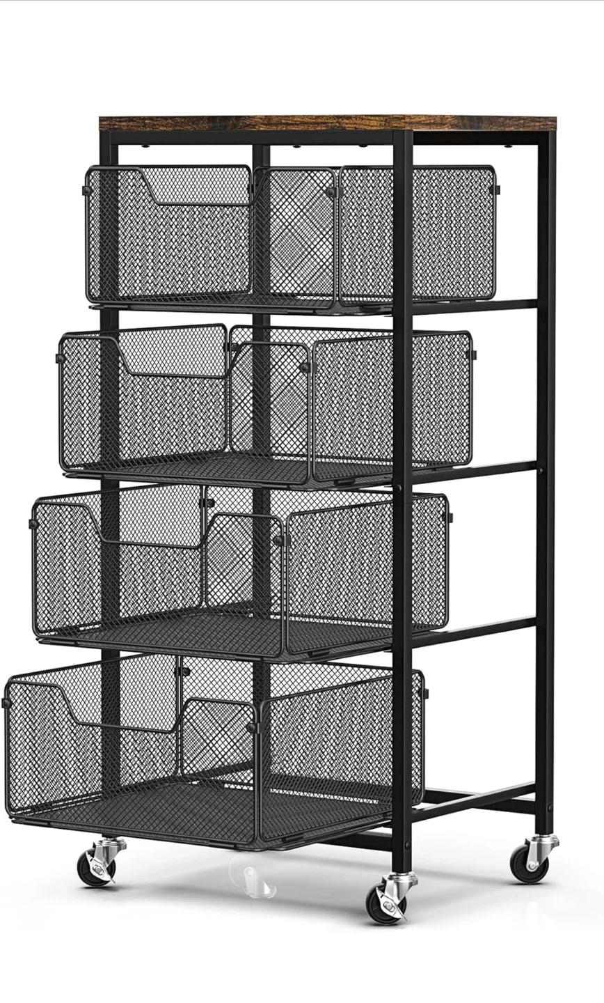 This 4-tier rolling storage cart features a rustic wood top and black mesh drawers. It's waterproof and easy to clean, making it a durable storage solution. This cart is great for organizing items in kitchens, offices, or bedrooms.
