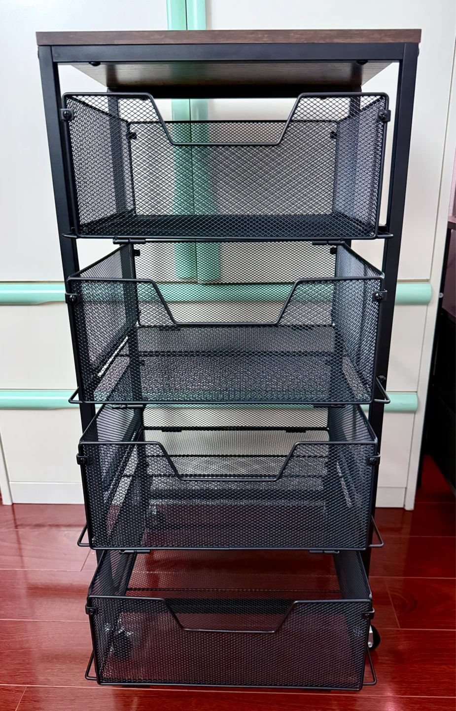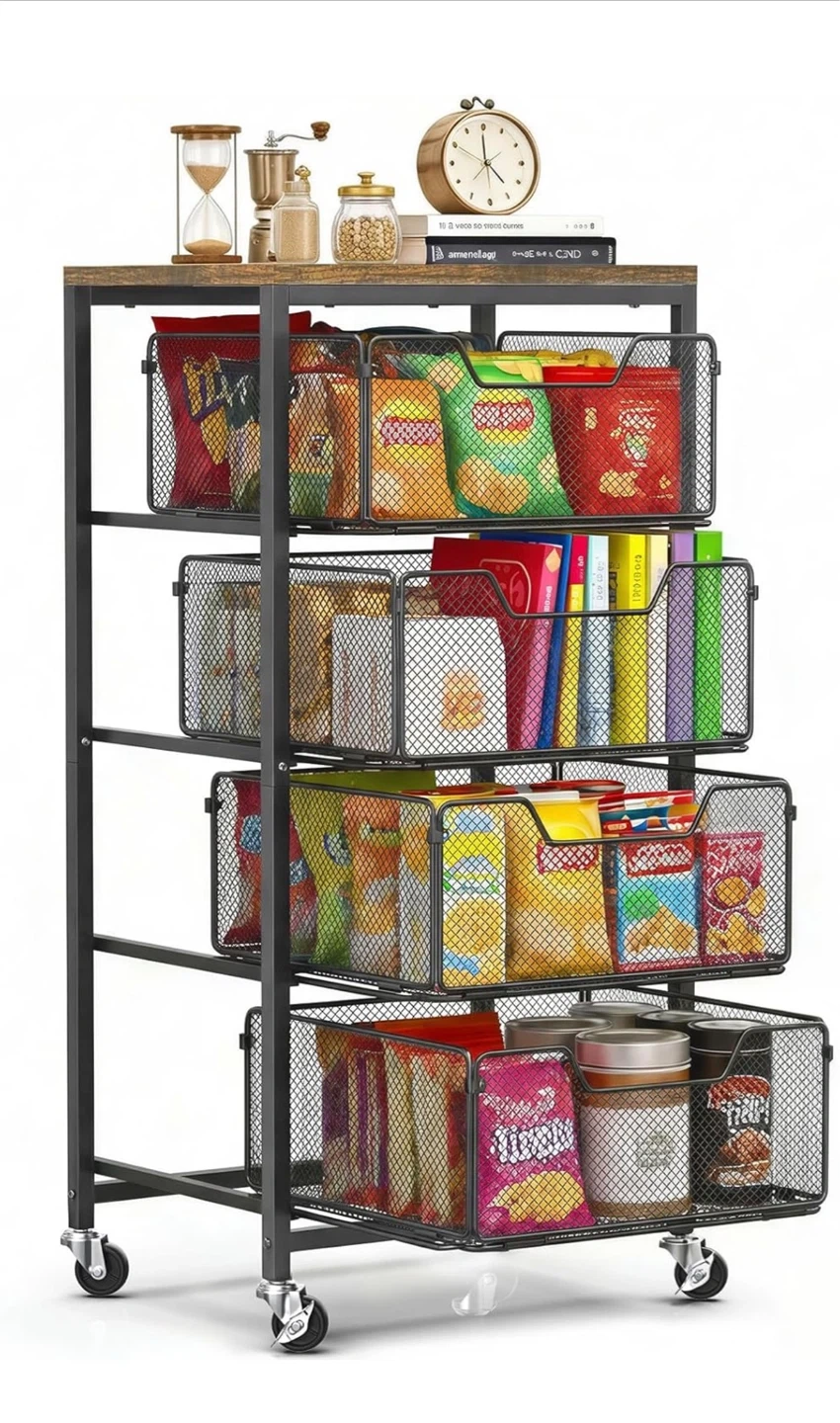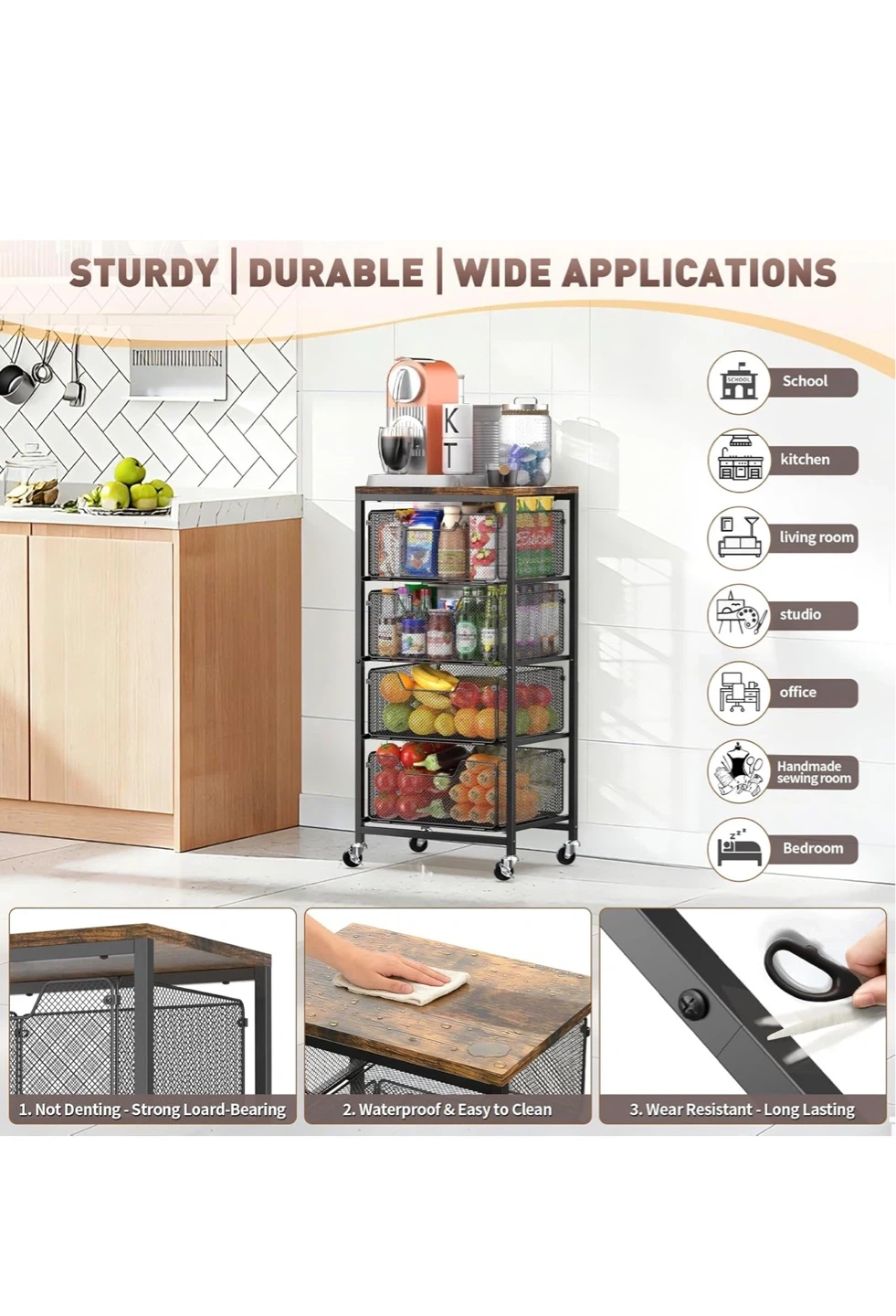 This 4-tier rolling storage cart features a rustic wood top and black mesh drawers. It's waterproof and easy to clean, making it a durable storage solution. This cart is great for organizing items in kitchens, offices, or bedrooms.