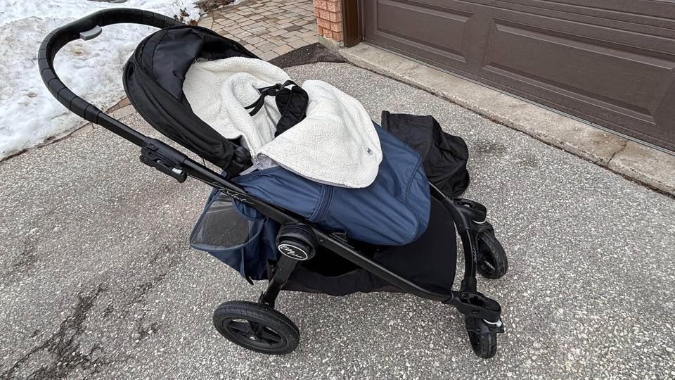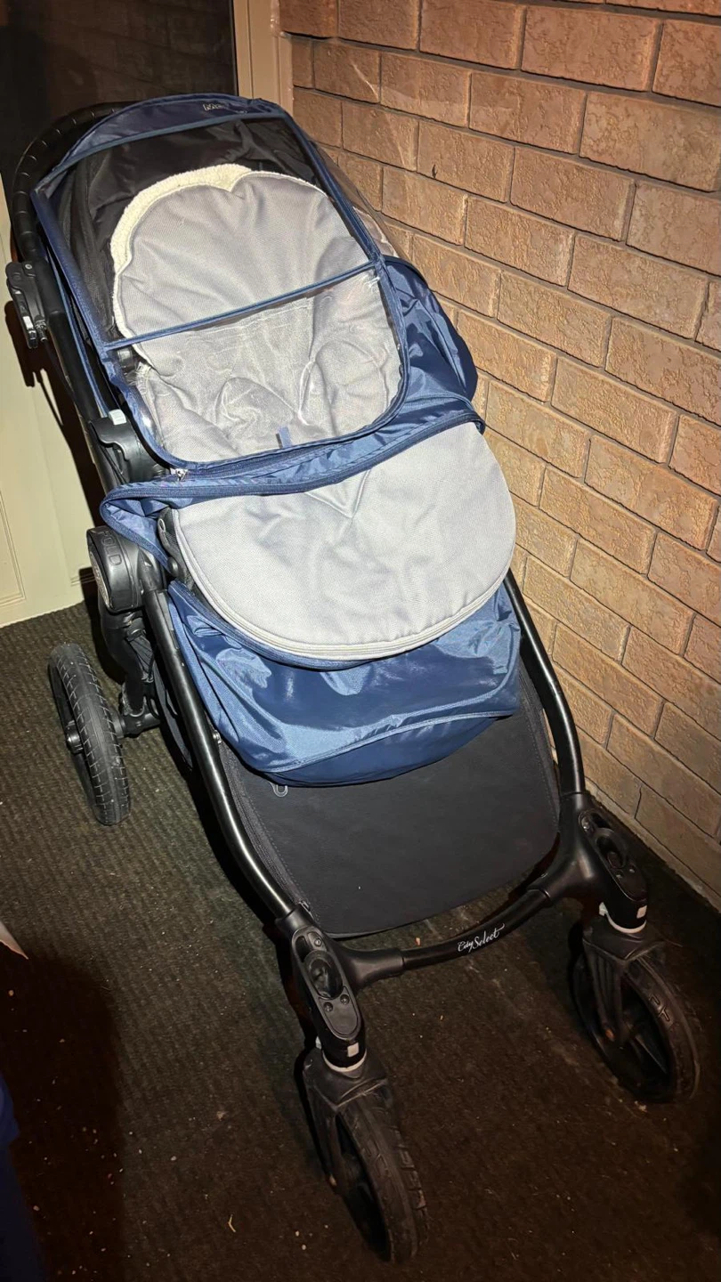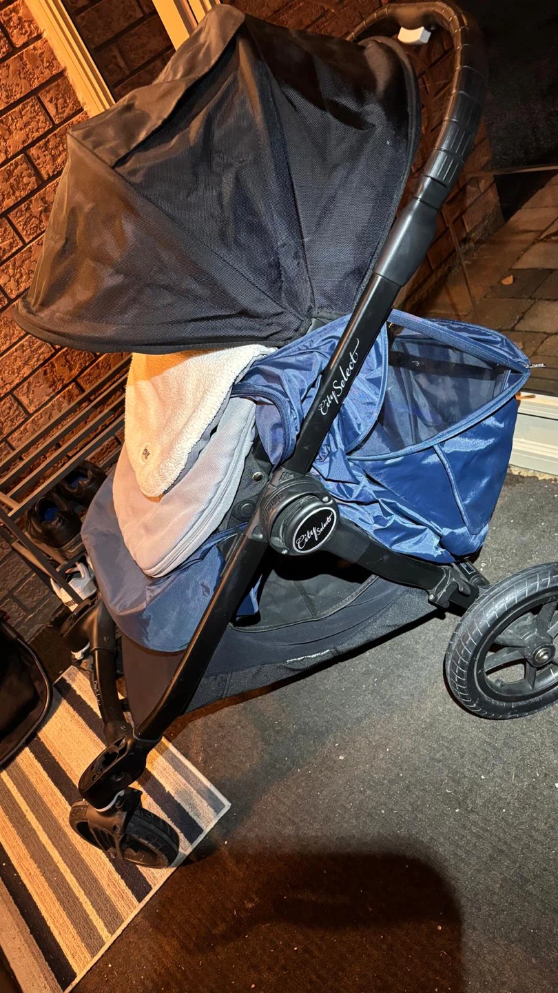 Versatile Baby Jogger City Select stroller system. Includes the main stroller with one seat and a super cozy white liner. Also comes with an extra seat or bassinet attachment, so you can configure it how you need. Super handy for one kiddo or two. Easy to fold and push around.