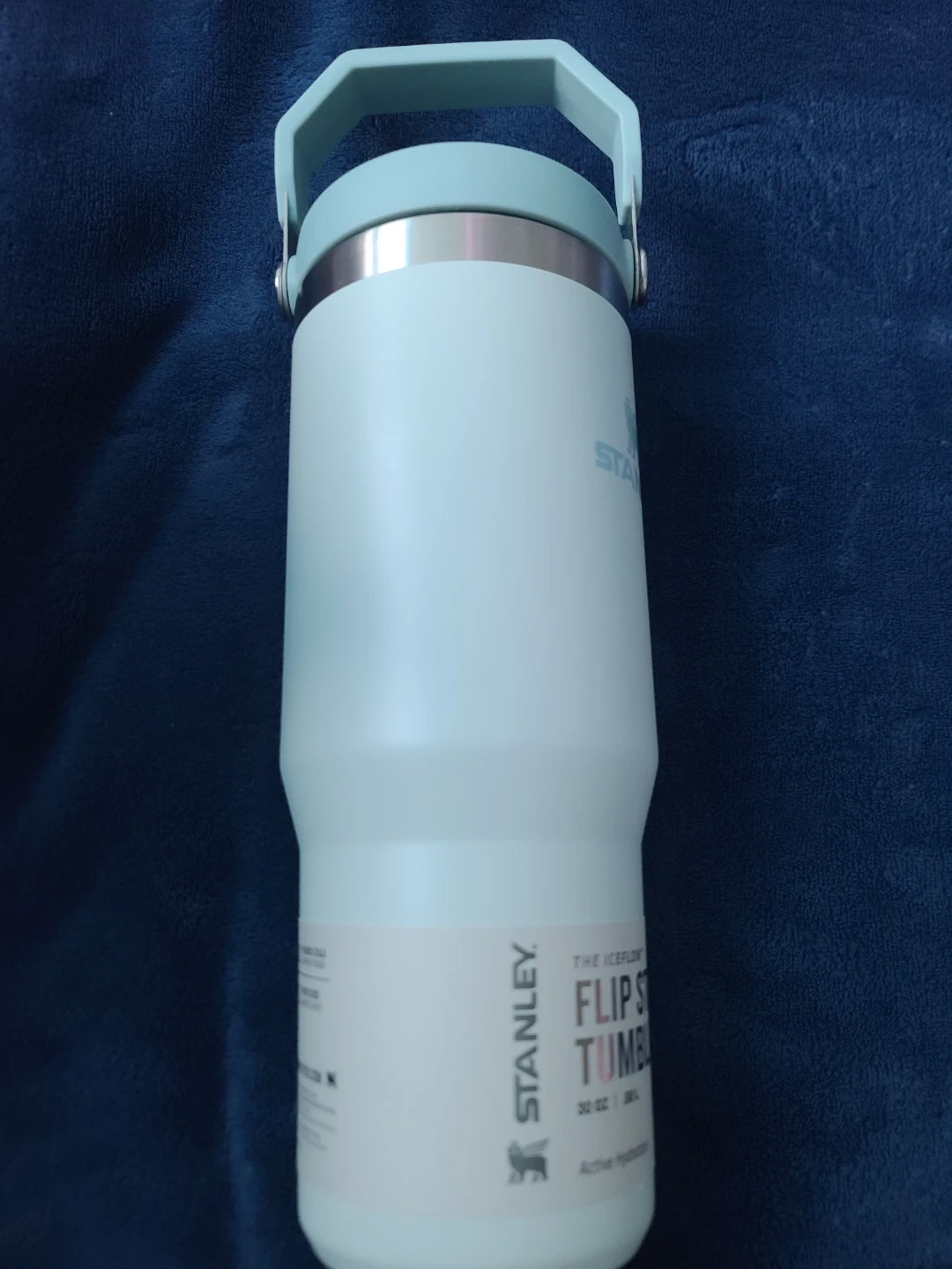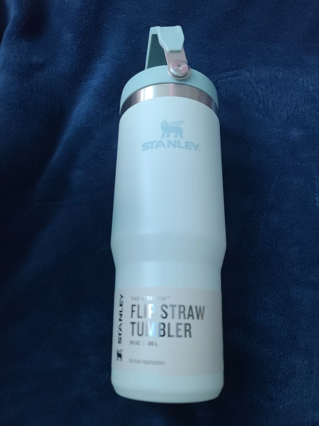This is a light blue Stanley Flip Straw Tumbler. It's a 30oz (900ml) tumbler. The flip straw lid makes it easy for on-the-go hydration. Stainless steel construction.
