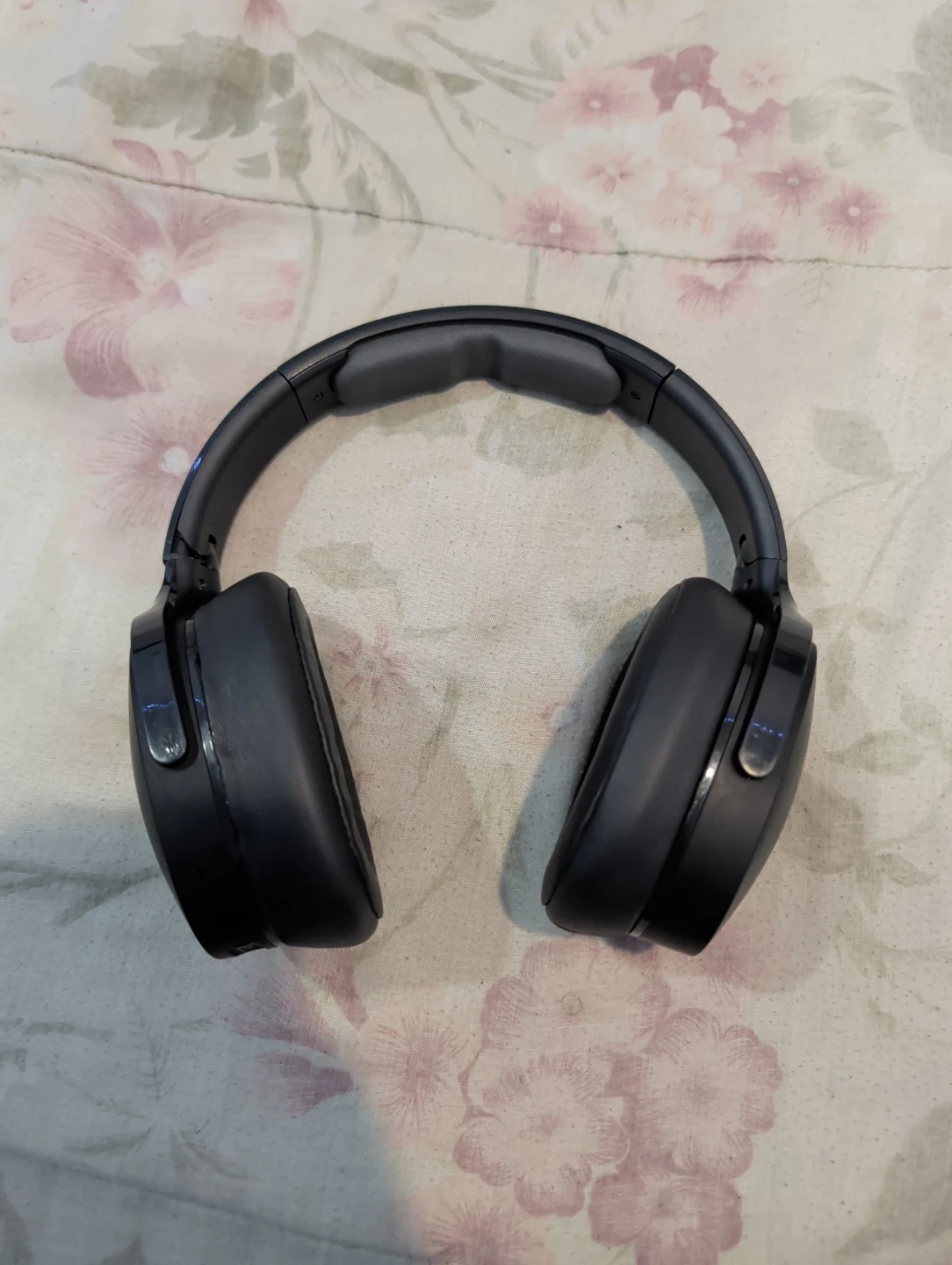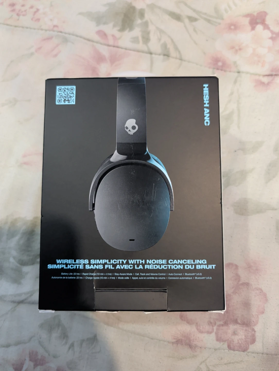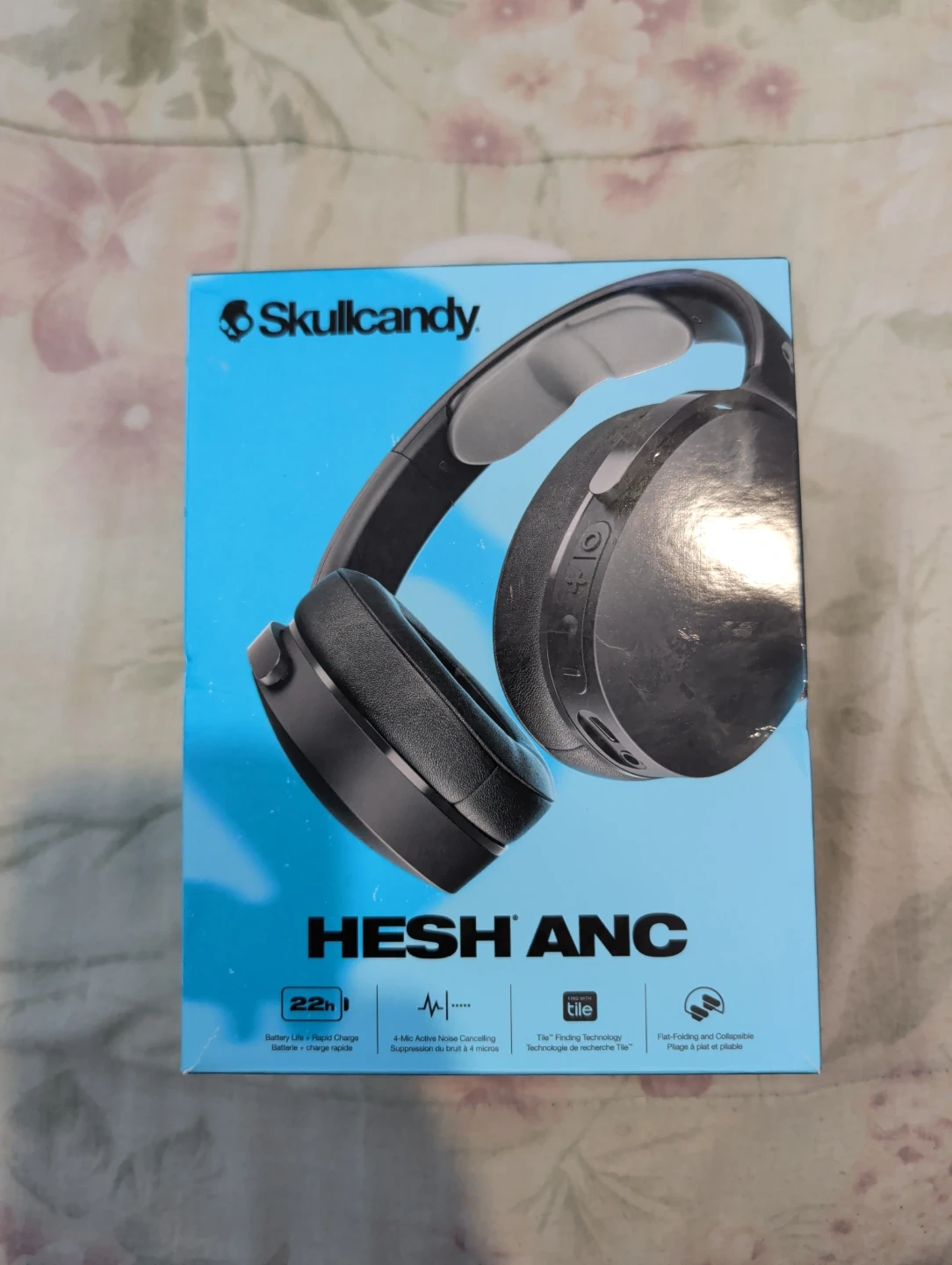 Selling a pair of Skullcandy Hesh ANC wireless headphones in black! These headphones offer wireless simplicity with noise cancelling. The box is included. They are flat-folding and collapsible for easy storage. Includes original box, carrying case, and charger cable. The headphones cups are in good condition but the hinge is cracked. Hinge is still fully functional. All internals work perfectly well.
