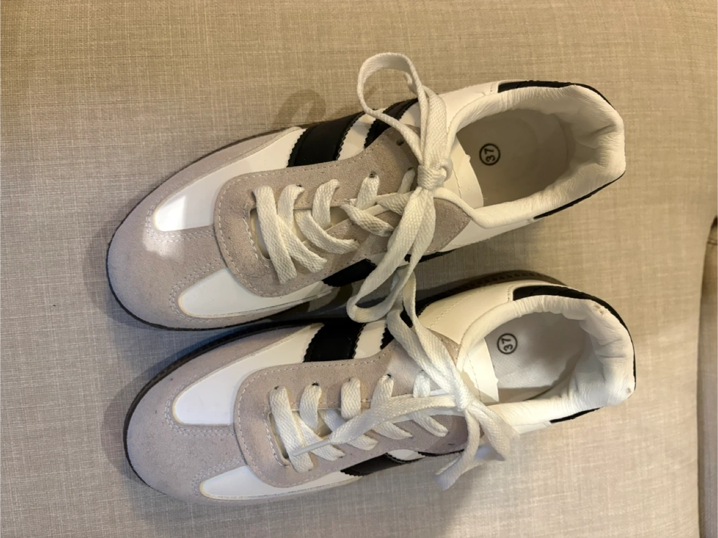 Selling a pair of brand new sneakers in size 7 (EU 37). They feature a classic design mock samba style with white and grey suede accents and black stripes. Great for casual wear! Cash