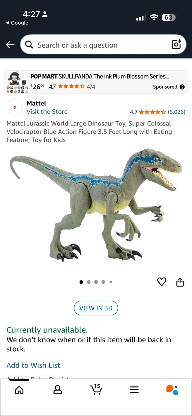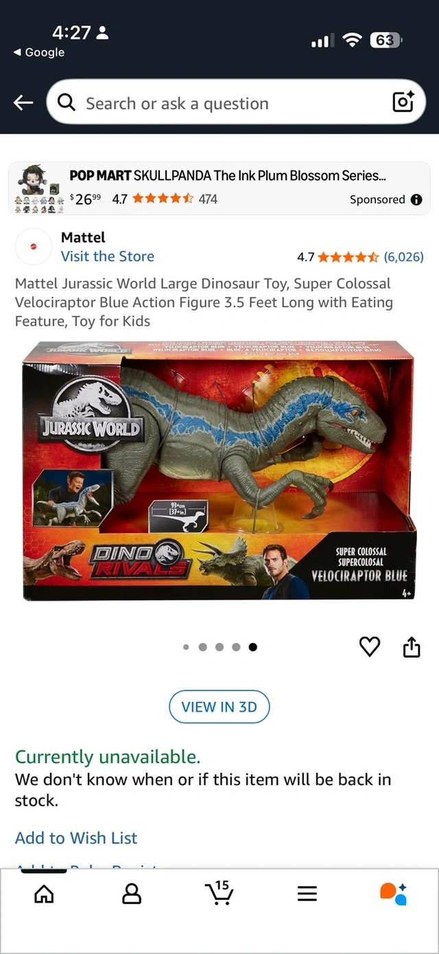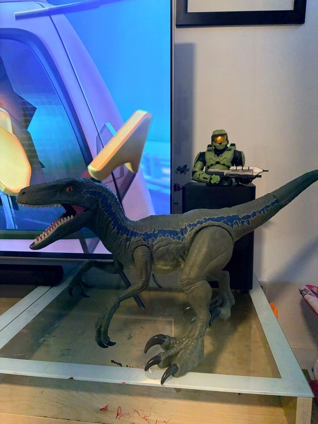 This is a Mattel Jurassic World Super Colossal Velociraptor Blue action figure, standing 3.5 feet long. This dinosaur figure has an eating feature, making it a great toy for kids who love dinosaurs. This is a used toy and has been gently enjoyed. It’s still ready for lots more exciting adventures in a new home! Yes, it's available if you're seeing this ad!