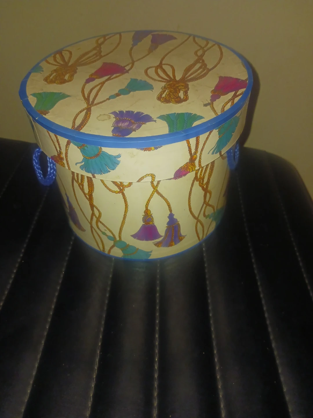 This is a decorative round storage box. It features a cream-colored background with a repeating pattern of tassels and rope accents. The box has blue trim and braided blue handles. It's perfect for storing small items or as a decorative accent piece!