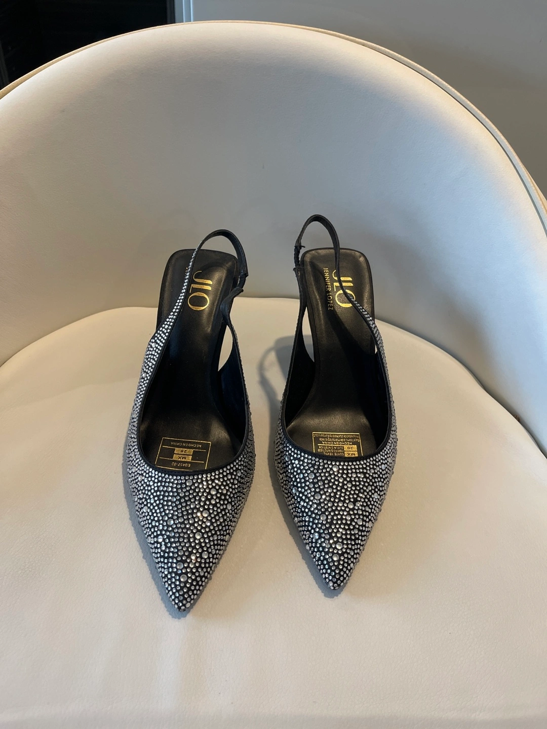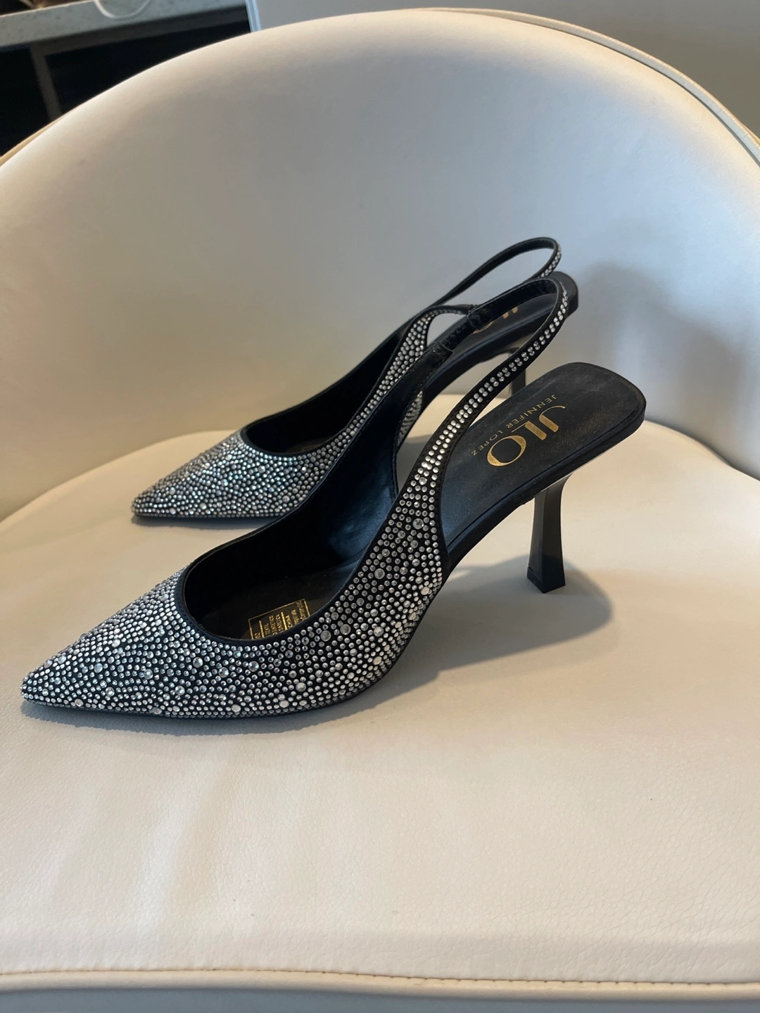 Sparkle and shine with these JLO Jennifer Lopez heels! They feature a black slingback design and are covered in rhinestones. Size 8.