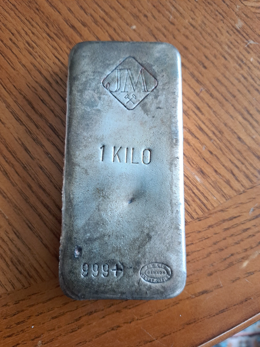 Selling a JM Bullion 1 Kilo Silver Bar. It is marked with '.999+' indicating its silver purity. A great investment piece!