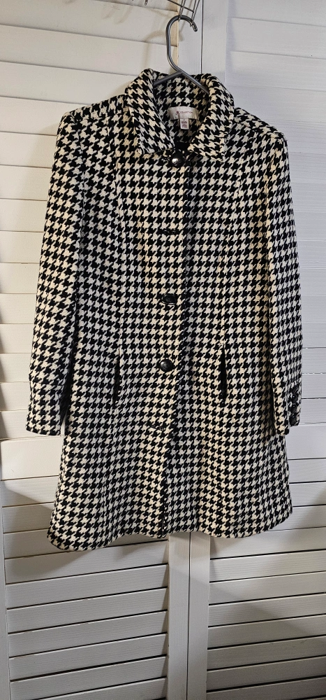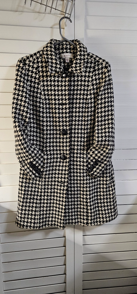 1000+very good condition. Women's medium coat. Black and white houndstooth pattern. Long sleeves. Button closure. Wool blend.