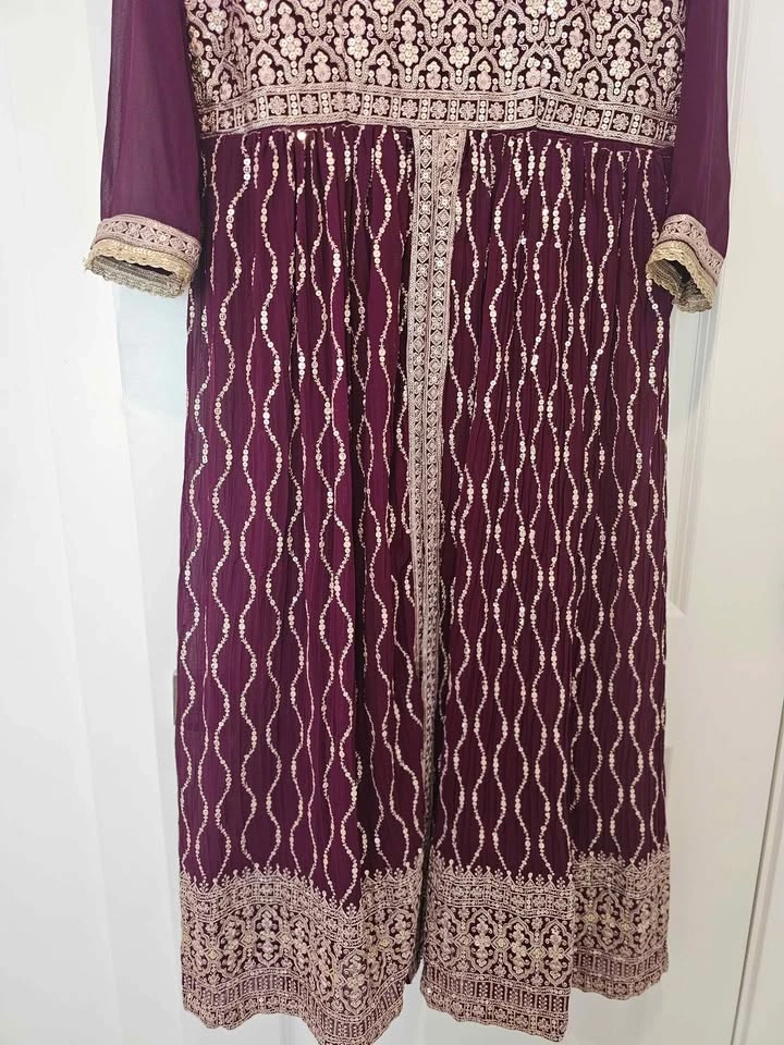 Gorgeous maroon dress with tons of sequin and embroidery work. Long sheer sleeves and a pretty V-neck. This dress is super detailed, great for any special occasion or party. Fits sizes XL, L, can be altered to smaller sizes. Worn once. 3pieces included (top, bottom, chunni)