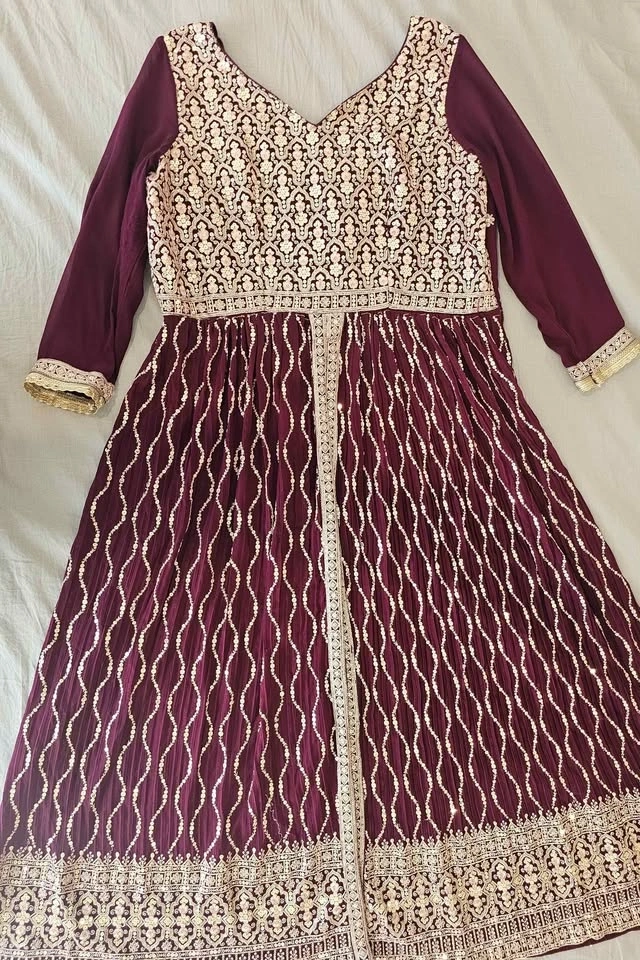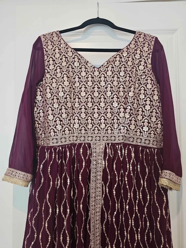 Gorgeous maroon dress with tons of sequin and embroidery work. Long sheer sleeves and a pretty V-neck. This dress is super detailed, great for any special occasion or party. Fits sizes XL, L, can be altered to smaller sizes. Worn once. 3pieces included (top, bottom, chunni)
