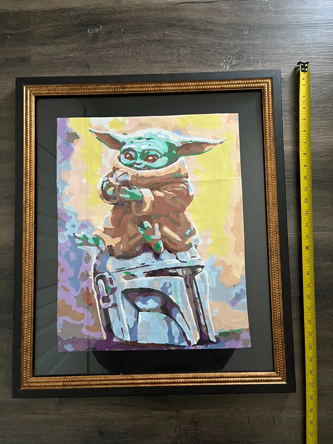 This is a framed paint by numbers artwork featuring Baby Yoda. It measures approximately 16x20 inches, not including the frame. The artwork is ready to hang and would be a fun addition for any Star Wars fan!