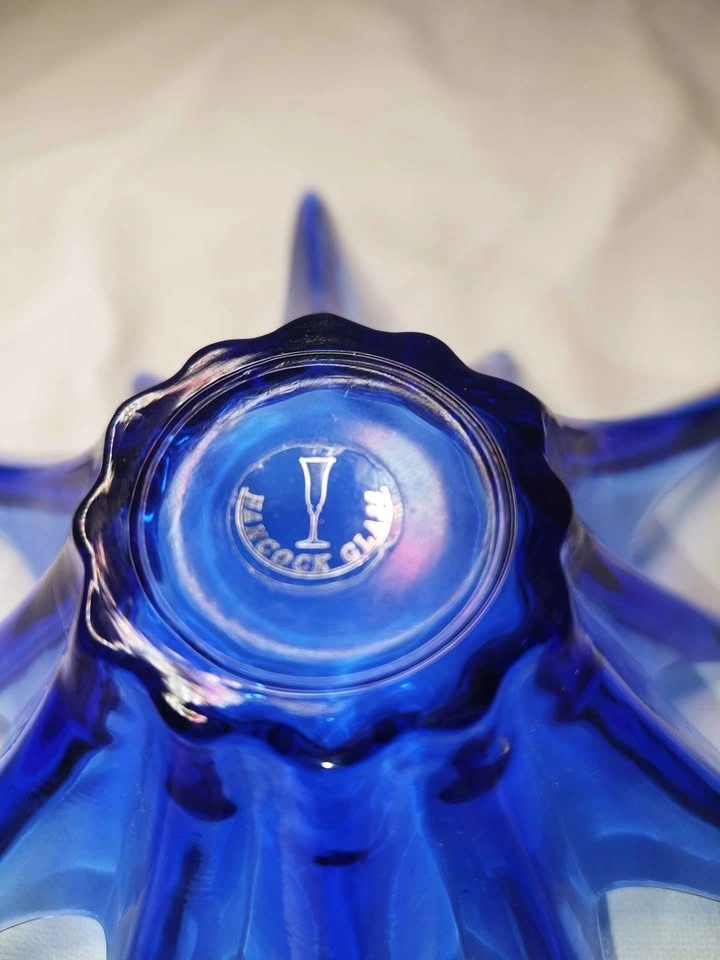 Blue starburst glass sculpture. The sculpture is made of blue glass and has a starburst shape with multiple pointed spikes. It has a glossy finish. Small. Pick up Stony Plain Spruce Grove area.