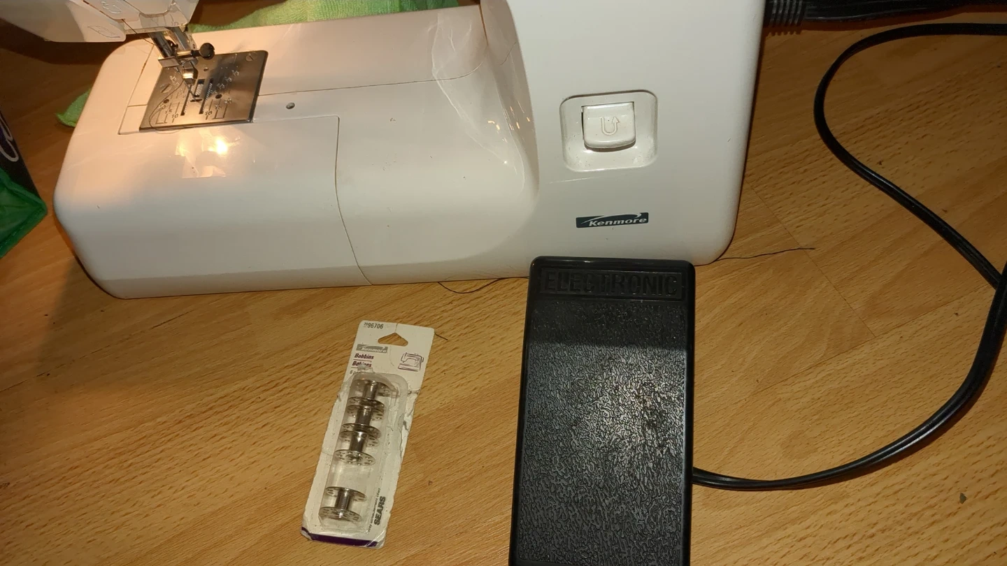 This Kenmore sewing machine offers a variety of stitch patterns. It comes with a foot pedal. Extra bobbins. Perfect for home sewing projects!