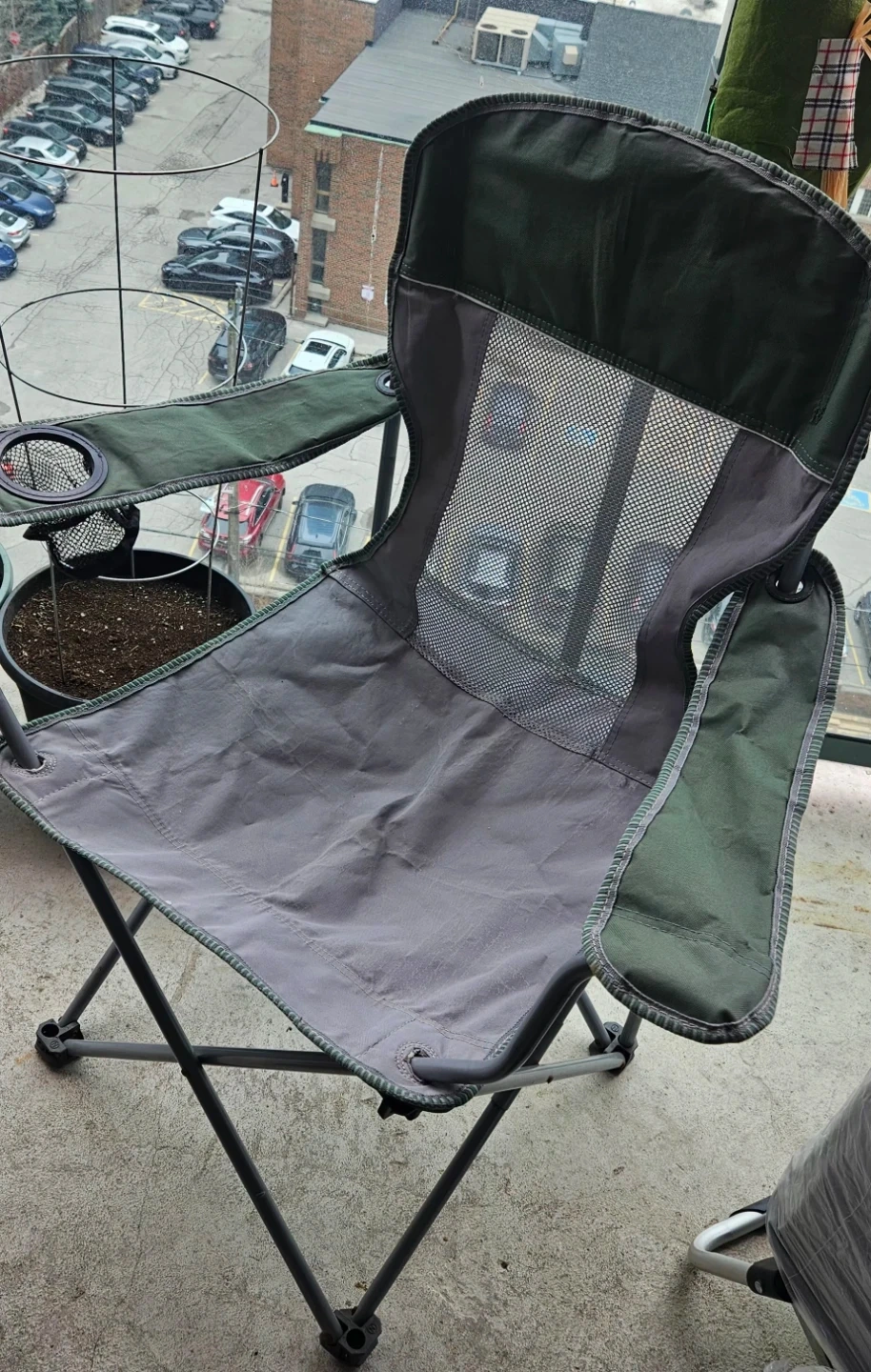 This is a folding camping chair with a grey fabric seat and dark green accents. It has a mesh back for breathability and a built-in cup holder in one armrest. Folds flat for easy transport and storage.