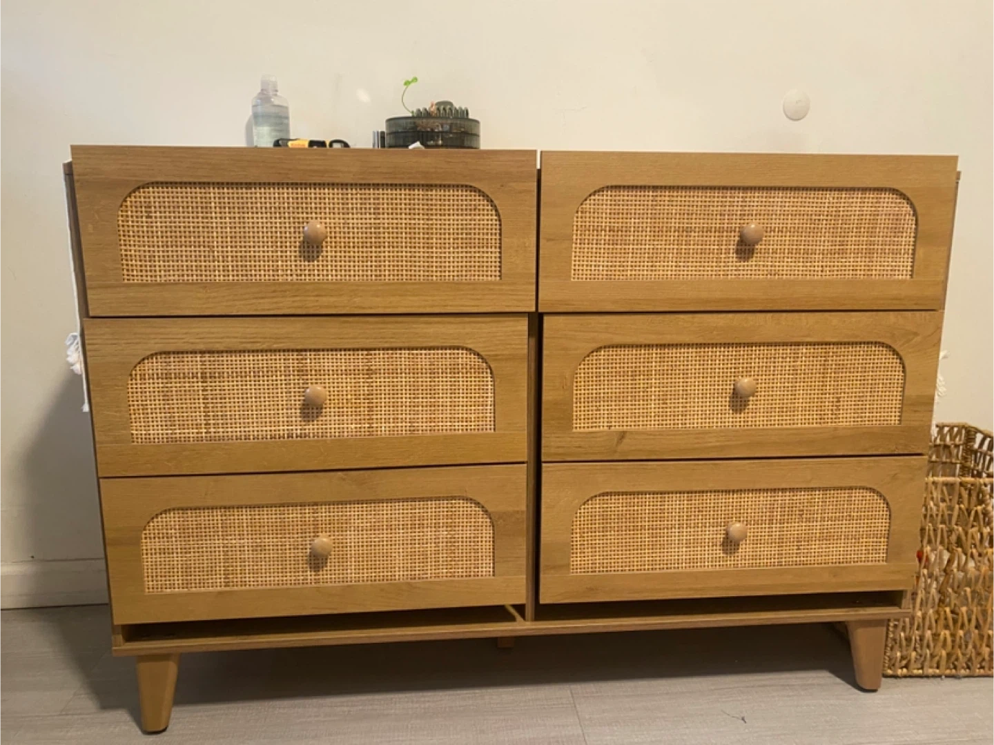 This dresser features a light wood finish with woven rattan drawer fronts. It has six drawers with round wooden pulls. Its legs are tapered wooden.