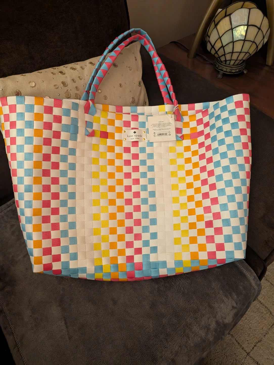 This is a Kate Spade woven tote bag! It's in great condition and perfect for carrying all your essentials. The colorful design adds a fun touch to any outfit. It's a great size for everyday use or a weekend getaway