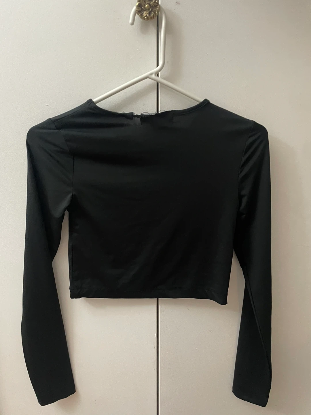 This black long sleeve crop top features a front cutout detail. It's made of a stretchy material for a comfortable fit. It would be a stylish addition to your wardrobe!