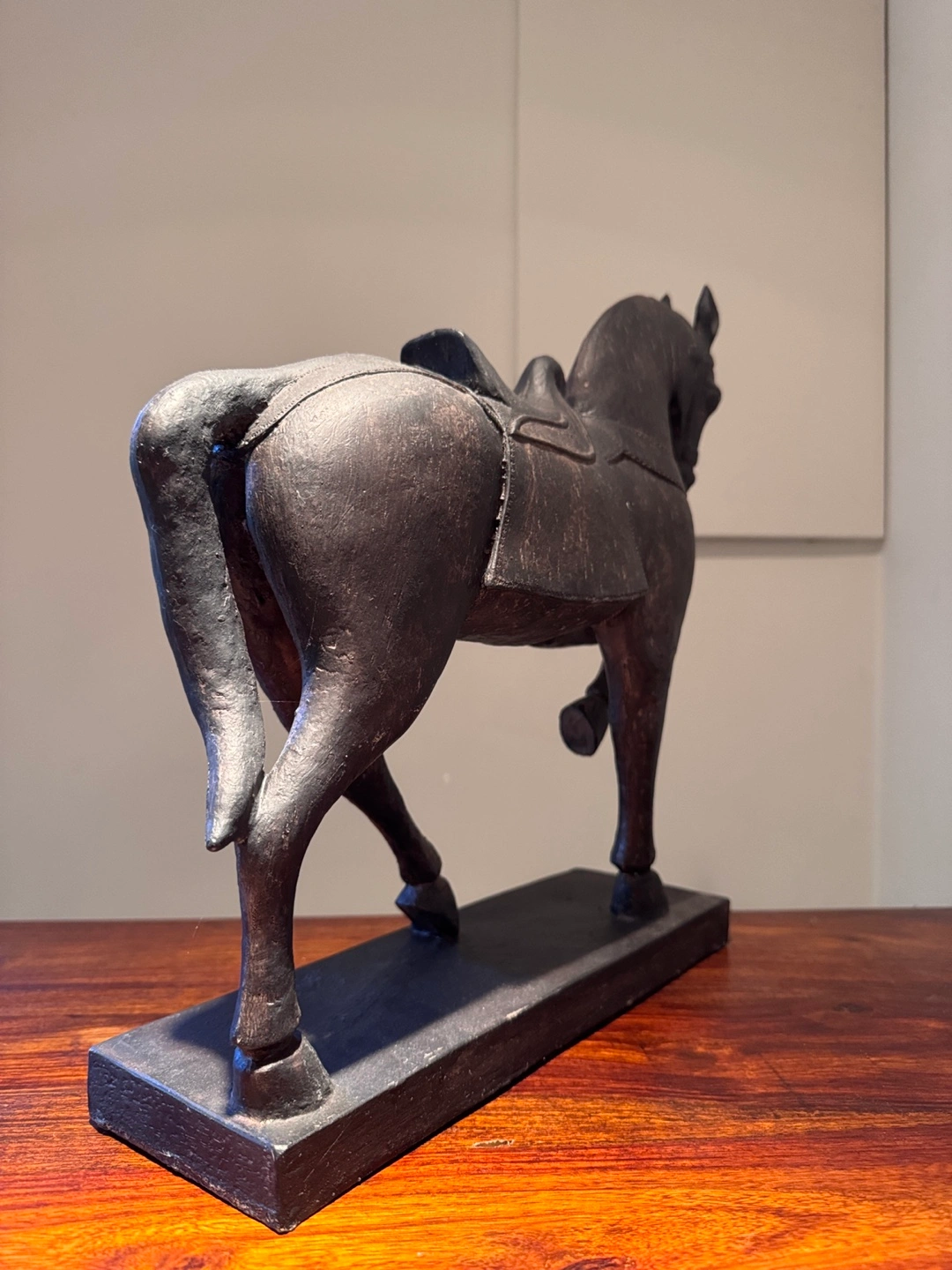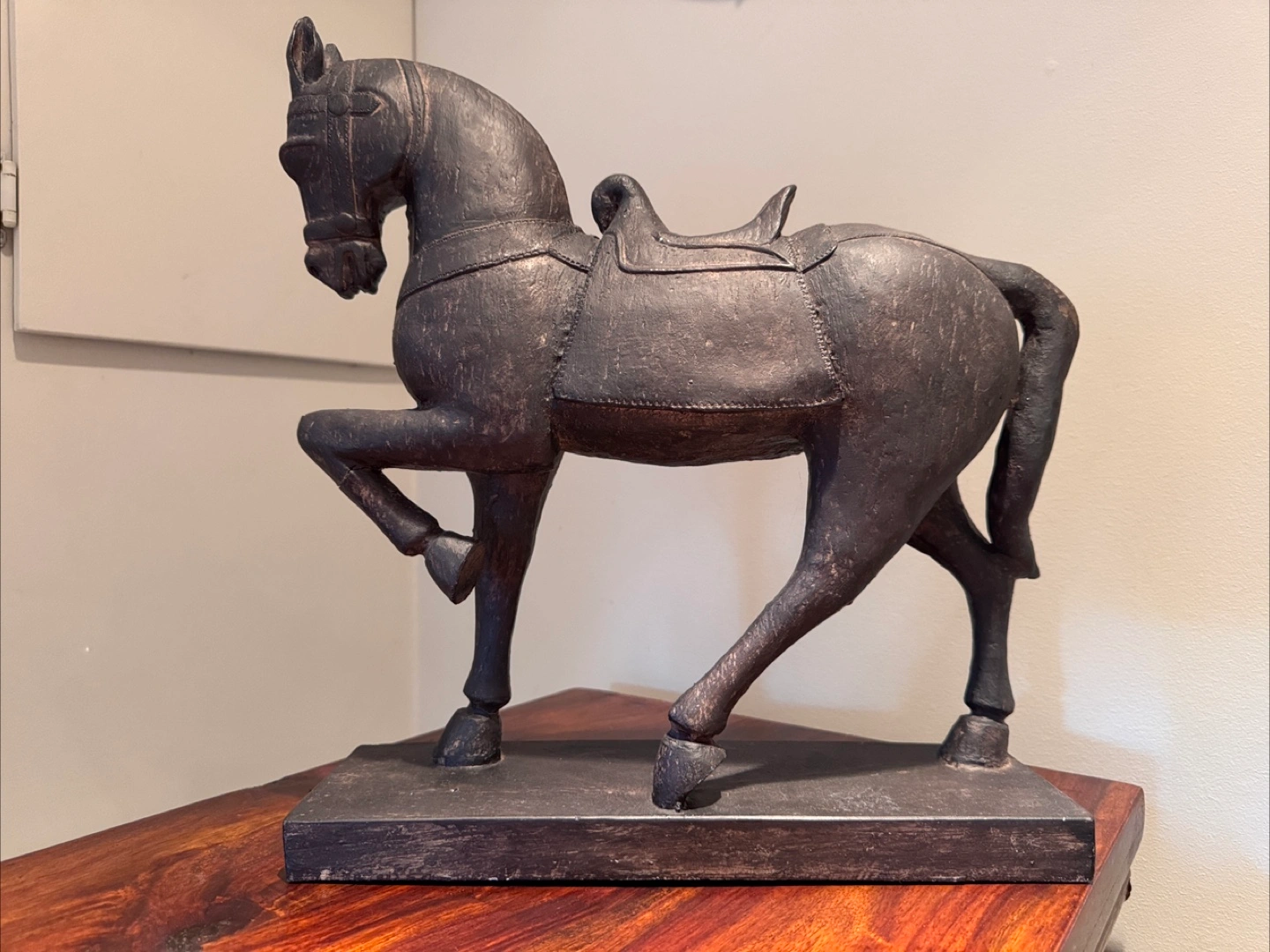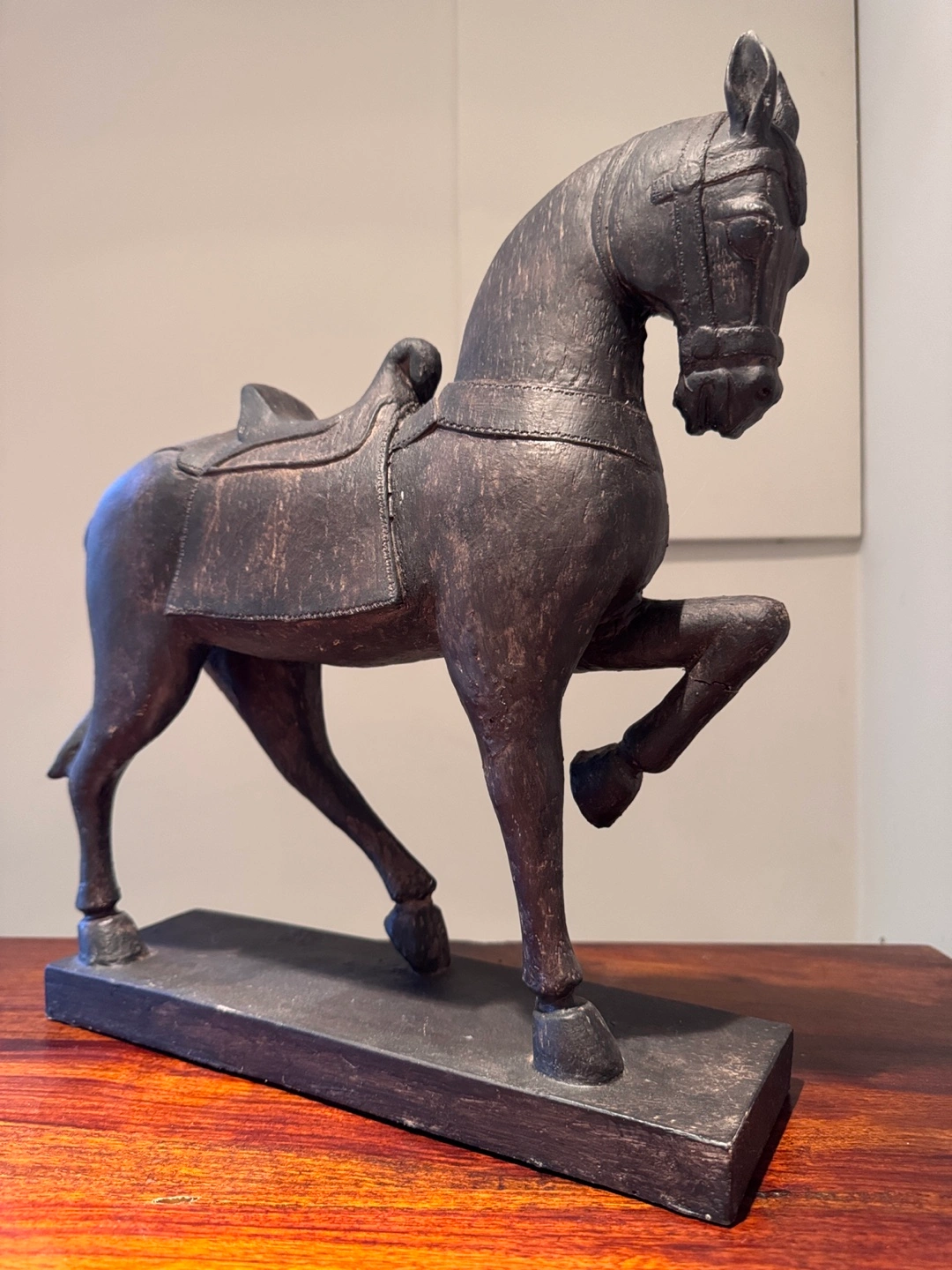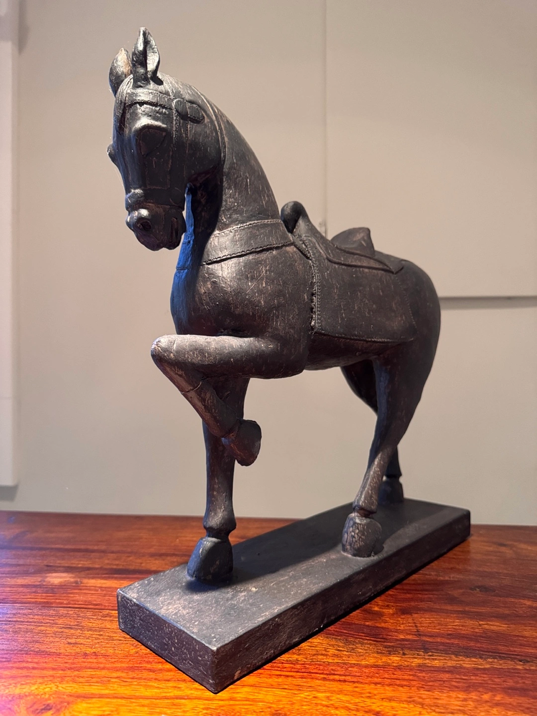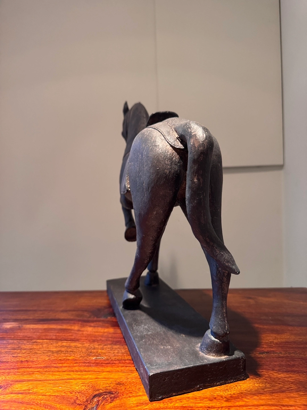 This Ebon sculpture captures the grace and strength of a horse in motion, with meticulous attention to anatomical detail. Features a saddle, rests on a dark brown rectangular base. Its dark finish and elegant stance make it a striking addition to any art collection. Collectible figurine